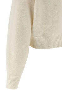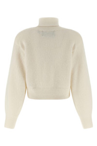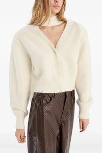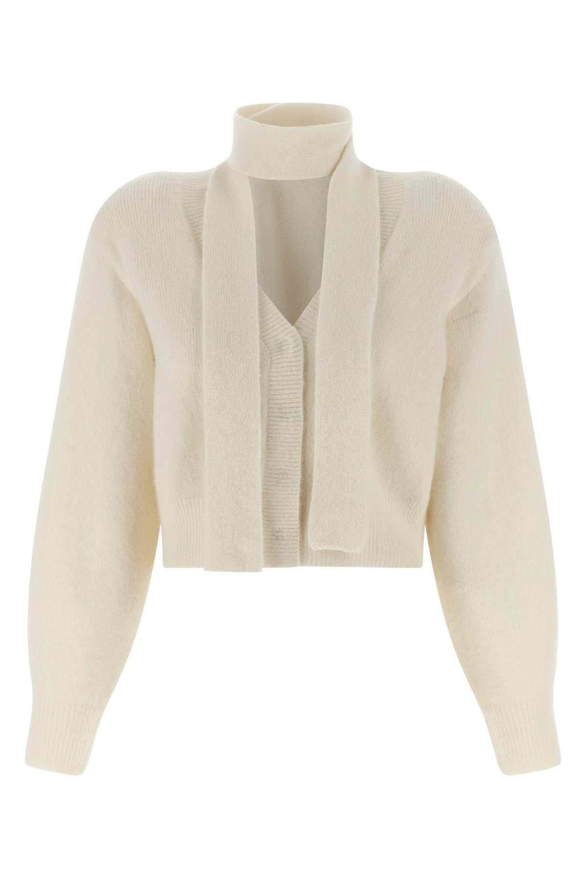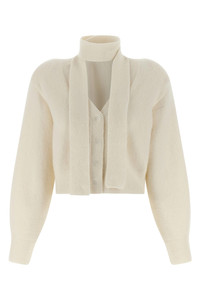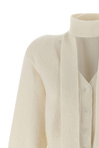 cod. 114736857857 Wool and alpaca blend cardigan with removable matching scarf detail, crop style, V-neck, front hidden snap button closure, removable padded shoulders, long wide sleeves with cuffs and dropped shoulder. Color: White Size & Fit: Comfort fit Composition: 32% wool 32% alpaca wool 30% polyamide 6% elastane Made in: Turkey