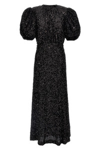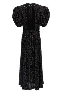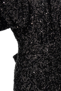 cod. 114050100100 Midi dress with all-over sequins, ribbon fastening at the neck and waist, short puff sleeves. SUSTAINABLE: Product made from recycled polyester. Color: Black Size & Fit: true to size fit German size Composition: 100% polyester Made in: China
