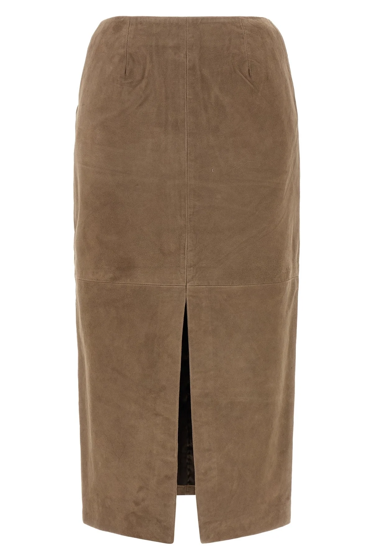 cod. 11530016831683 Suede midi skirt, pencil silhouette, front split, pockets, back zip closure, lining. Color: Beige Size & Fit: slim fit - GERMAN size Composition: 100% goat leather (Capra Hircus Hircus) Made in: India