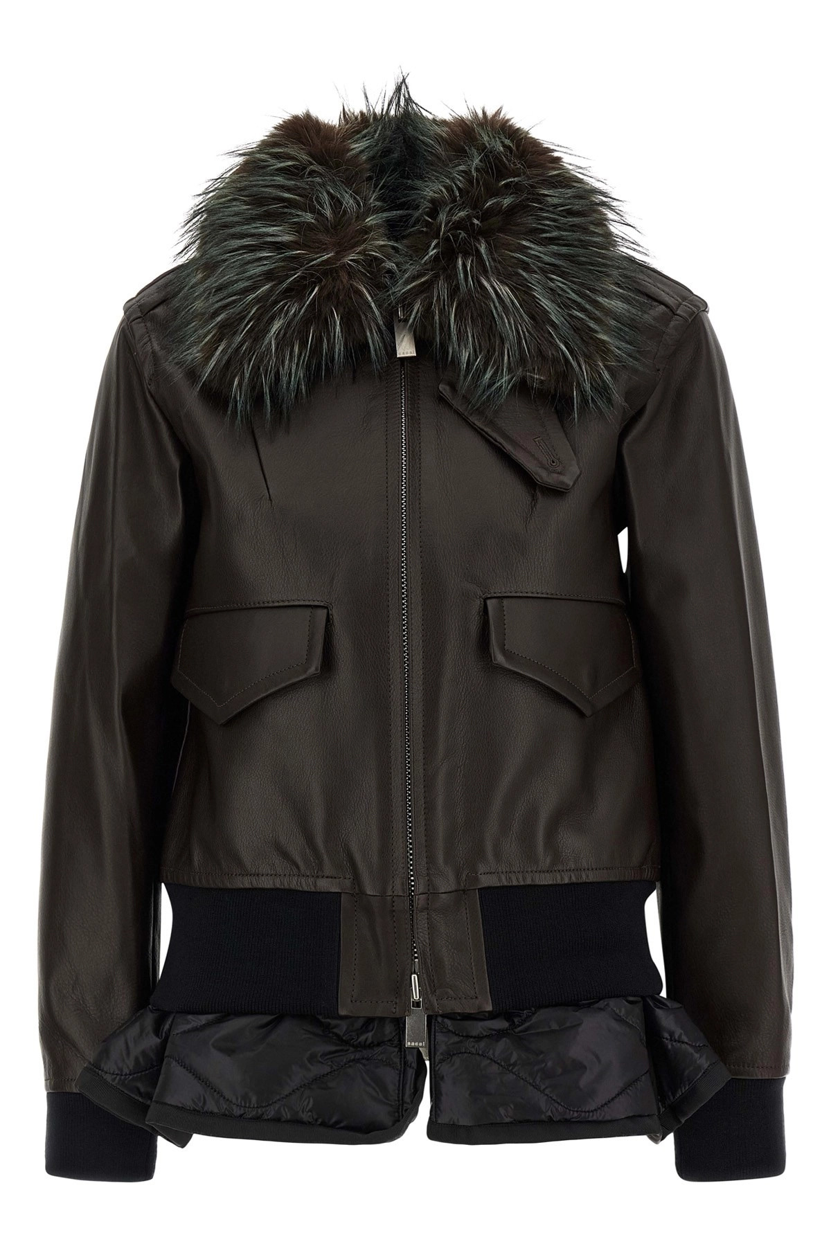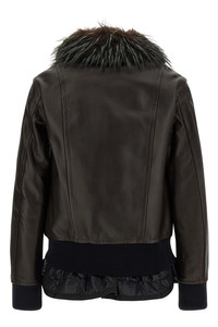 cod. 2508238601 2-in-1 leather jacket with stretch ribbed knit details, bomber jacket, shirt collar with removable fur-effect fabric insert, removable chin strap, front zip closure, pockets, long cuffed sleeves and removable inner vest in slightly padded quilted nylon, V-neck, front zip closure, pockets, flounced hem. Color: Brown Size & Fit: true to size fit Composition: 100% leather Made in: Japan PROMO CODE NOT APPLICABLE