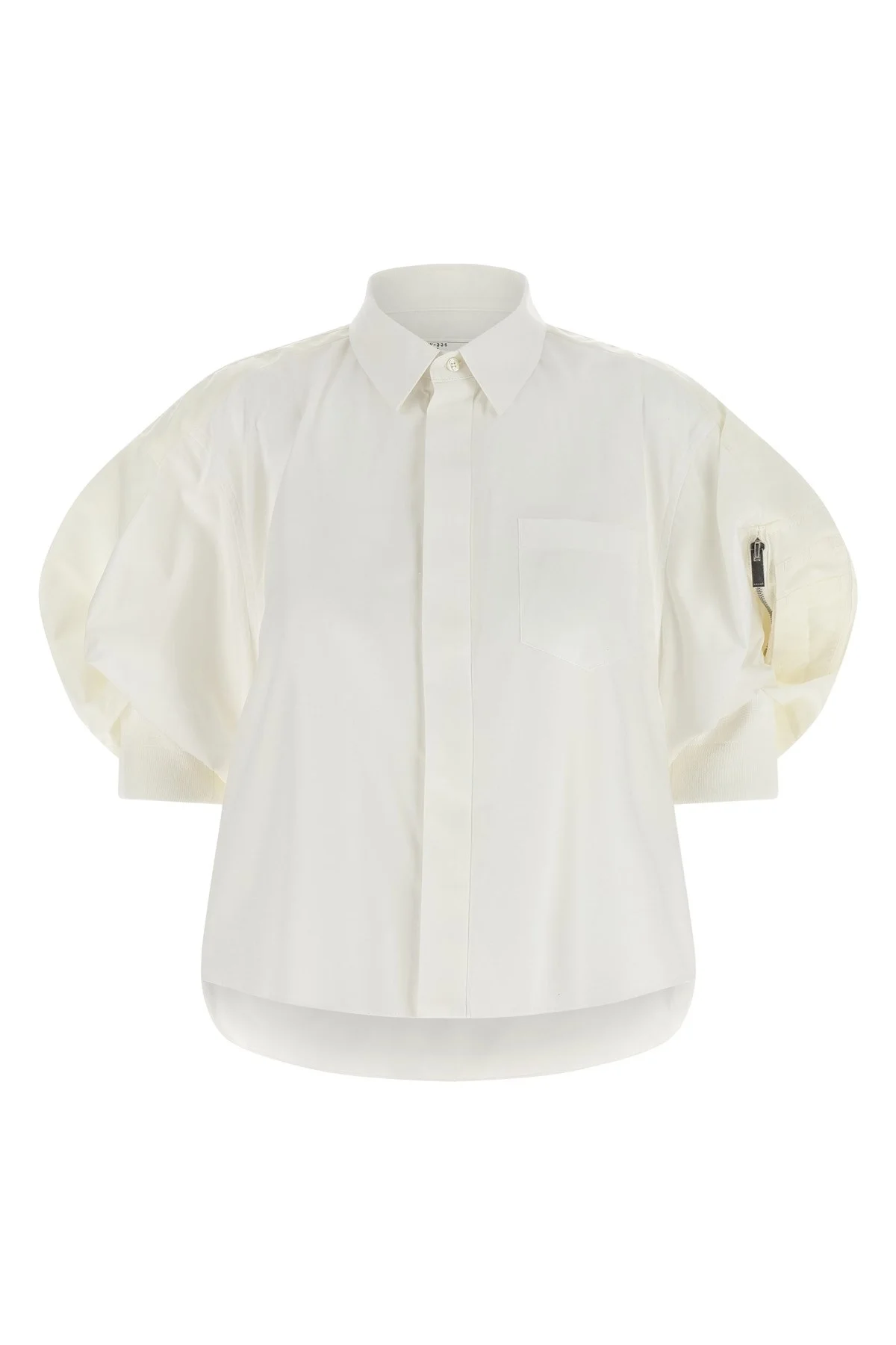 cod. SCW336151 Cotton poplin shirt, crop model, pocket, concealed front button closure, tonal nylon twill insert to create puff bomber sleeve style with stretch knit cuffs, rounded and asymmetrical hem. Color: White Size & Fit: Comfort fit Composition: 65% polyester, 35% cotton Made in: Japan