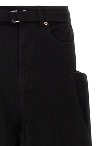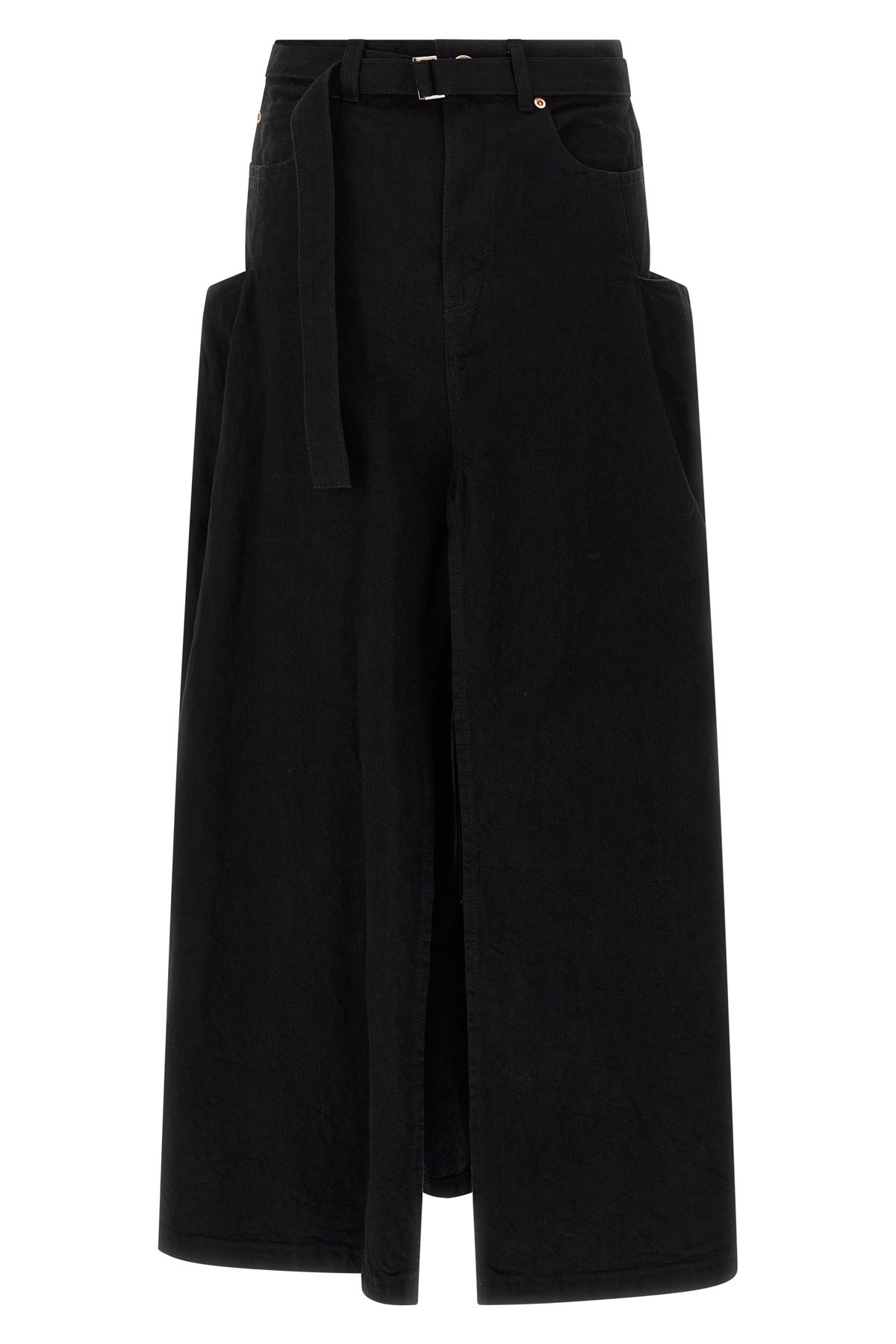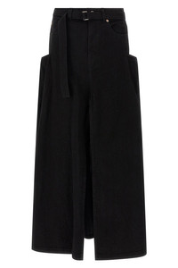 cod. 2508193001 Long skirt in garment-dyed cotton denim with trompe l'oeil trouser construction, front zip and button closure, pockets, wide front and back split, and removable belt. Color: Black Size & Fit: true to size fit Composition: 100% cotton Made in: Japan