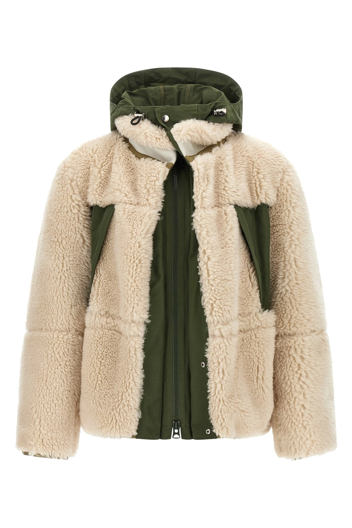 cod. 2503854M063 Wool parka with faux shearling inserts, front zip closure, high neck, adjustable hood, pockets, long sleeves, drawstring at the waist. Color: Multicolor Size & Fit: true to size fit Composition: 50% wool 28% acrylic 22% polyester Made in: Japan