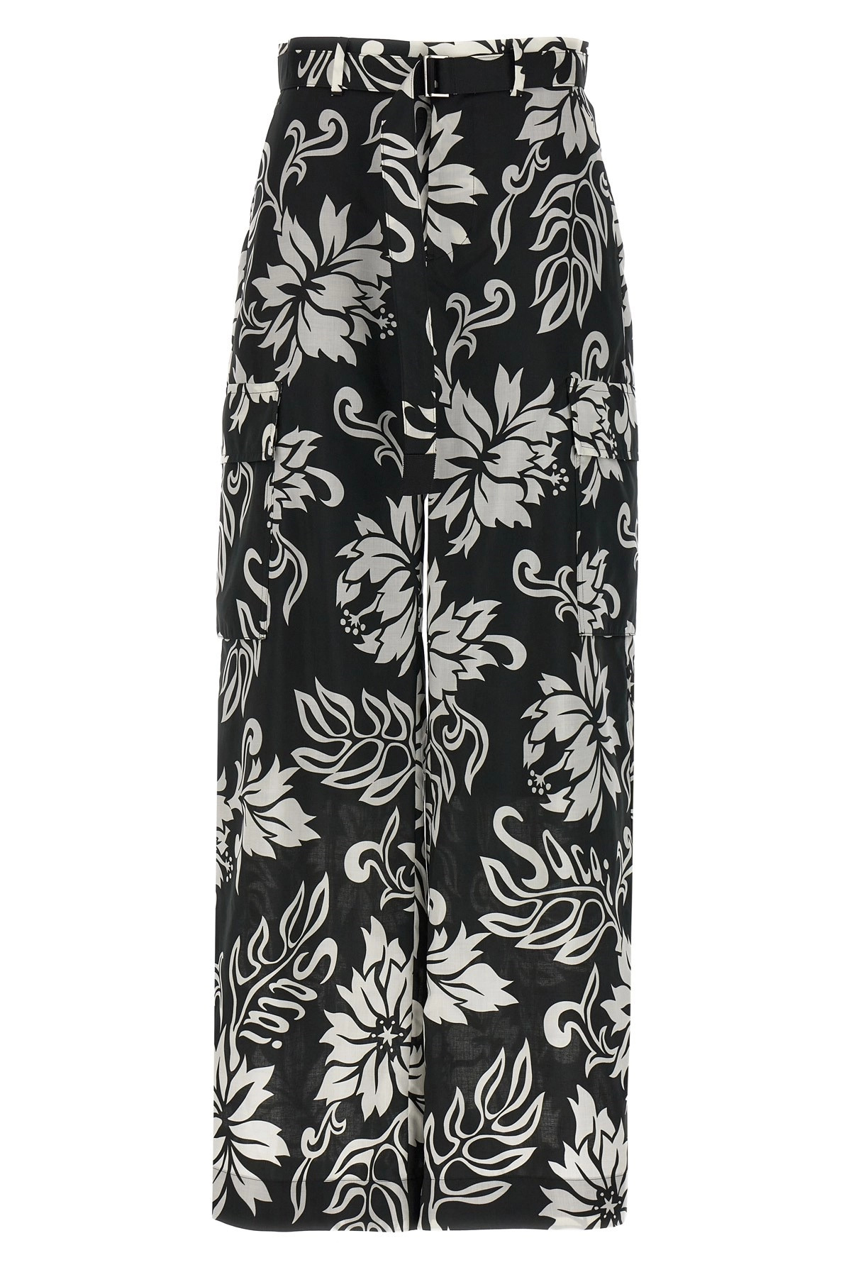 cod. 2407056001 Cargo cotton pants with side pockets, all-over floral print, and removable waist belt. Color: White/Black Size & Fit: true to size fit Made in: Japan