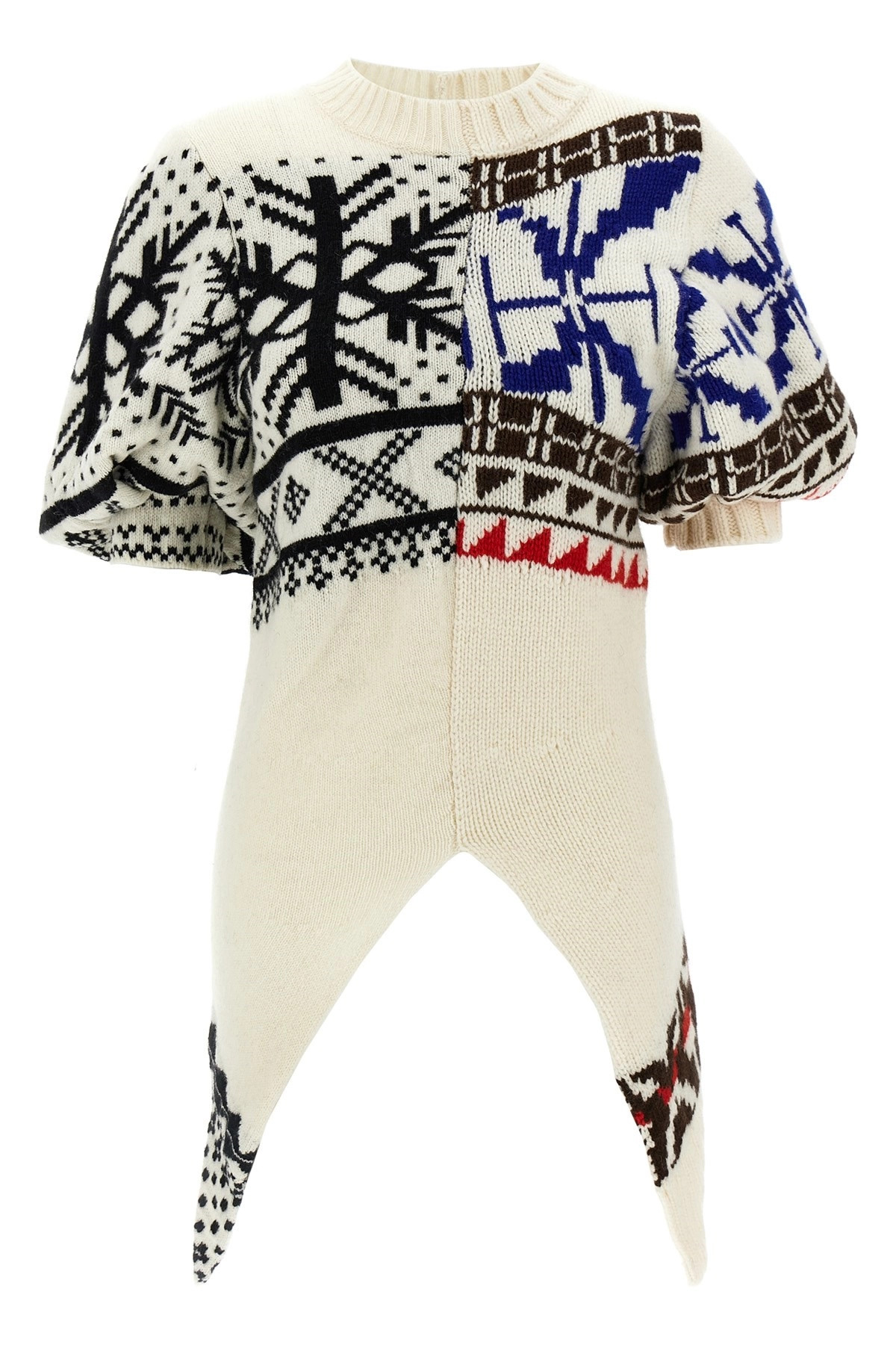 cod. 2407433175 Jacquard sweater in wool blend, crew neck, short puff sleeves with cuffs, asymmetrical hem. Color: Multicolor Size & Fit: true to size fit Composition: 80% wool, 20% nylon Made in: China