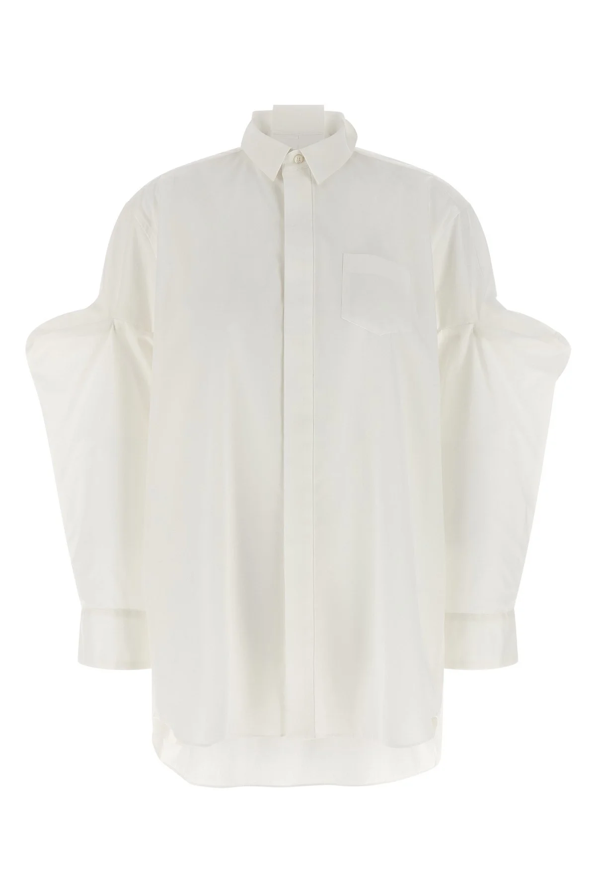 cod. 2608394151 Cotton poplin shirt, chest pocket, concealed front button closure, long sleeves with cuffs and gusset insert, rounded and asymmetrical hem. Color: White Size & Fit: Comfort fit Composition: 65% polyester, 35% cotton Made in: Japan