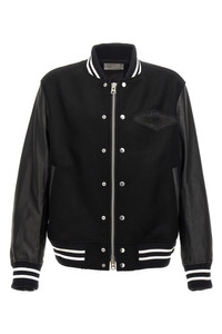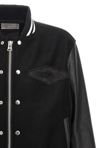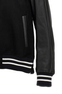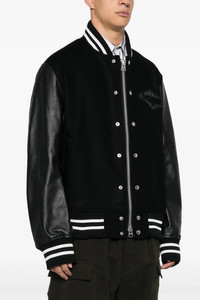 cod. 2403523M001 Sacai Gonz' wool bomber jacket with leather-effect fabric sleeves, button or zip closure, pockets, long cuffed sleeves, front logo patch, back embroidery. Color: Black Size & Fit: true to size fit Composition: 100% wool Made in: Japan