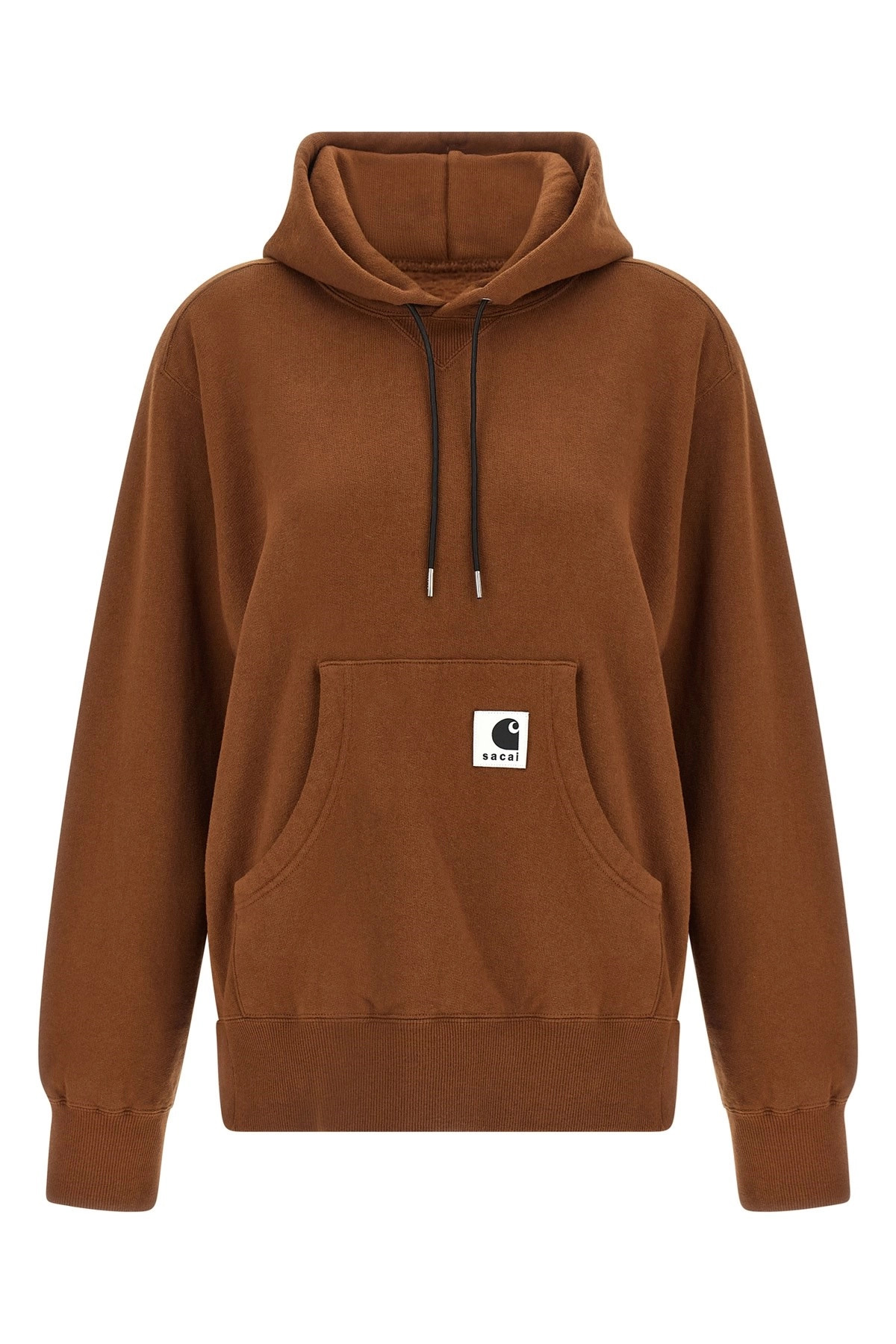 cod. 2500993S642 Sacai x Carhartt Wip capsule hoodie in fleece cotton with lightweight ribbed cotton inserts, kangaroo pocket with front logo patch, long sleeves with cuffs and dropped shoulders, side slits with snap buttons. Color: Brown Size & Fit: Comfort fit Composition: 100% cotton Made in: Japan PROMO CODE NOT APPLICABLE