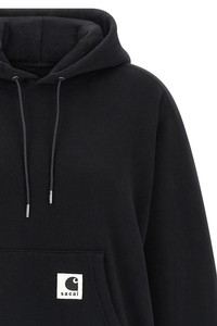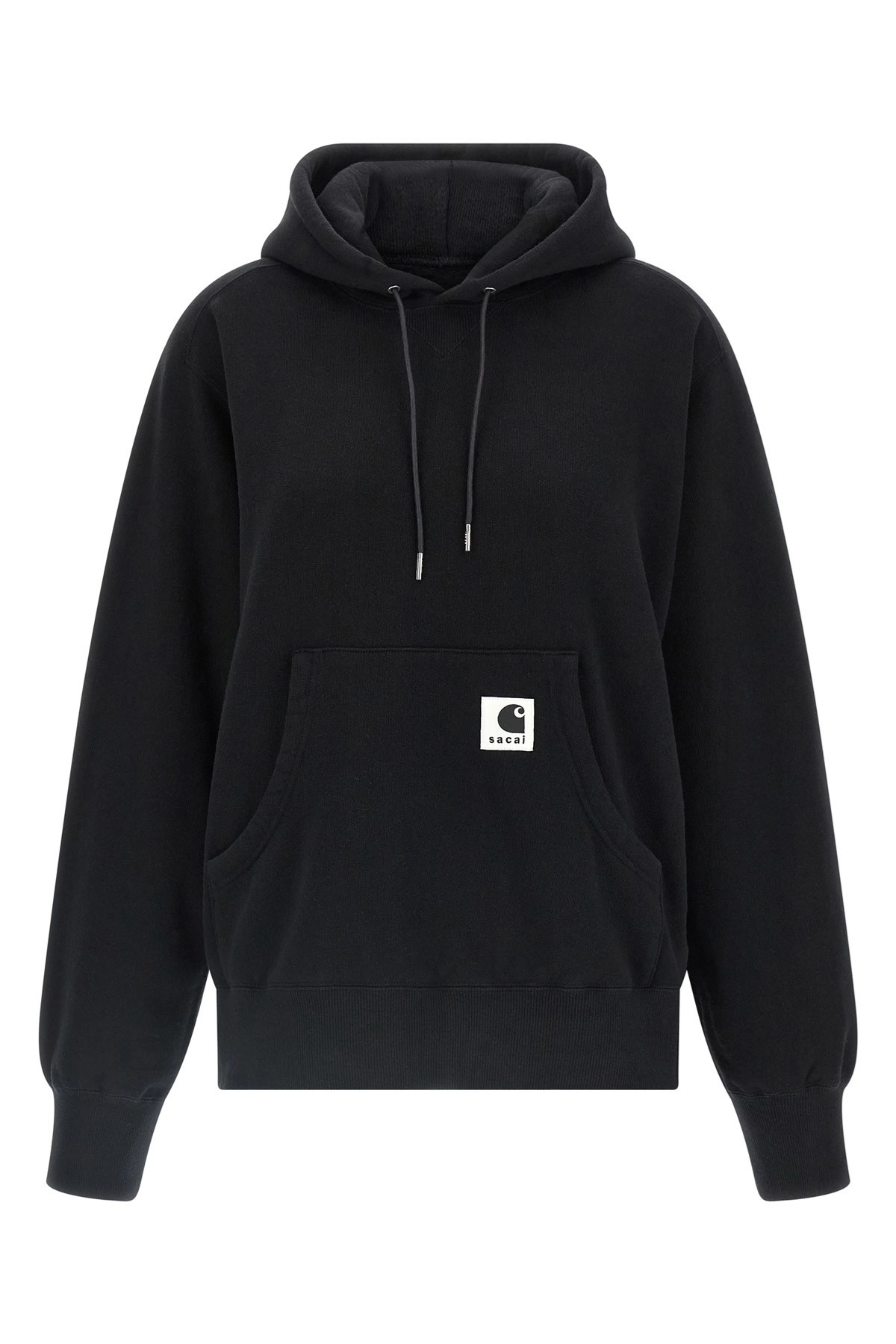 cod. 2500993S001 Sacai x Carhartt Wip capsule hoodie in fleece cotton with lightweight ribbed cotton inserts, kangaroo pocket with front logo patch, long sleeves with cuffs and dropped shoulders, side slits with snap buttons. Color: Black Size & Fit: Comfort fit Composition: 100% cotton Made in: Japan PROMO CODE NOT APPLICABLE