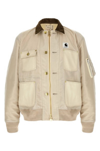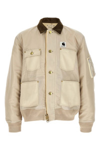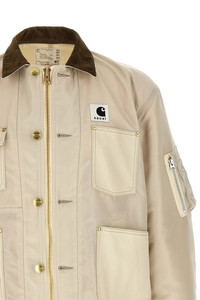 cod. 2603990M199 Sacai x Carhartt WIP 'Duck' jacket in 12oz Dearborn cotton canvas and tone-on-tone nylon twill with contrast corduroy collar, logo patch and front zip and button closure, pockets, long sleeves with stretch ribbed knit cuffs and dropped shoulder, stretch ribbed knit band on the hem. Lining. Color: Beige Size & Fit: Comfort fit Composition: 100% nylon Made in: Japan PROMO CODE NOT APPLICABLE