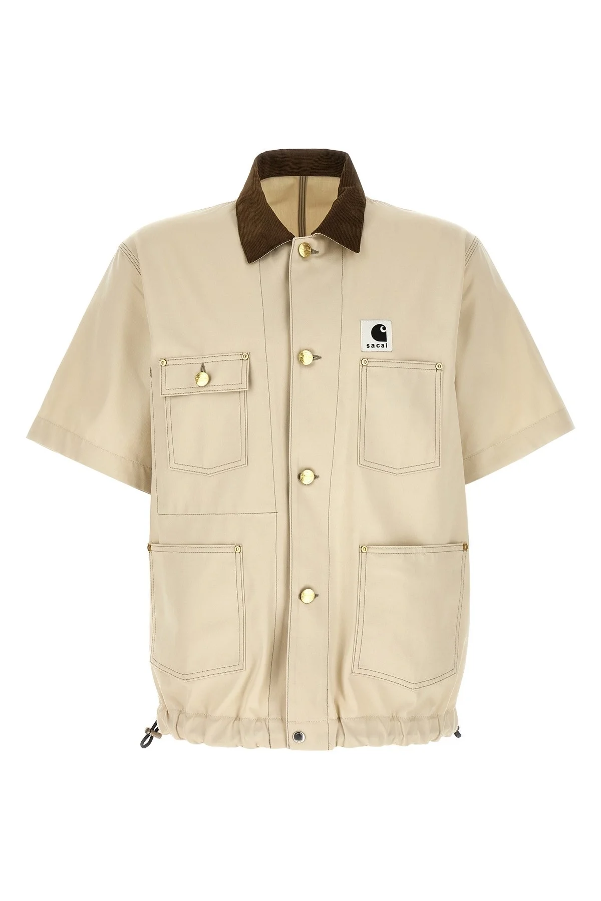 cod. 2603991M199 Sacai x Carhartt WIP 'Duck' shirt in Dearborn Canvas canvas with contrast corduroy collar, logo patch and front button closure, pockets, short sleeves with dropped shoulder, two pleats at the back, drawstring on the hem. Color: Beige Size & Fit: Comfort fit Composition: 100% cotton Made in: Japan PROMO CODE NOT APPLICABLE