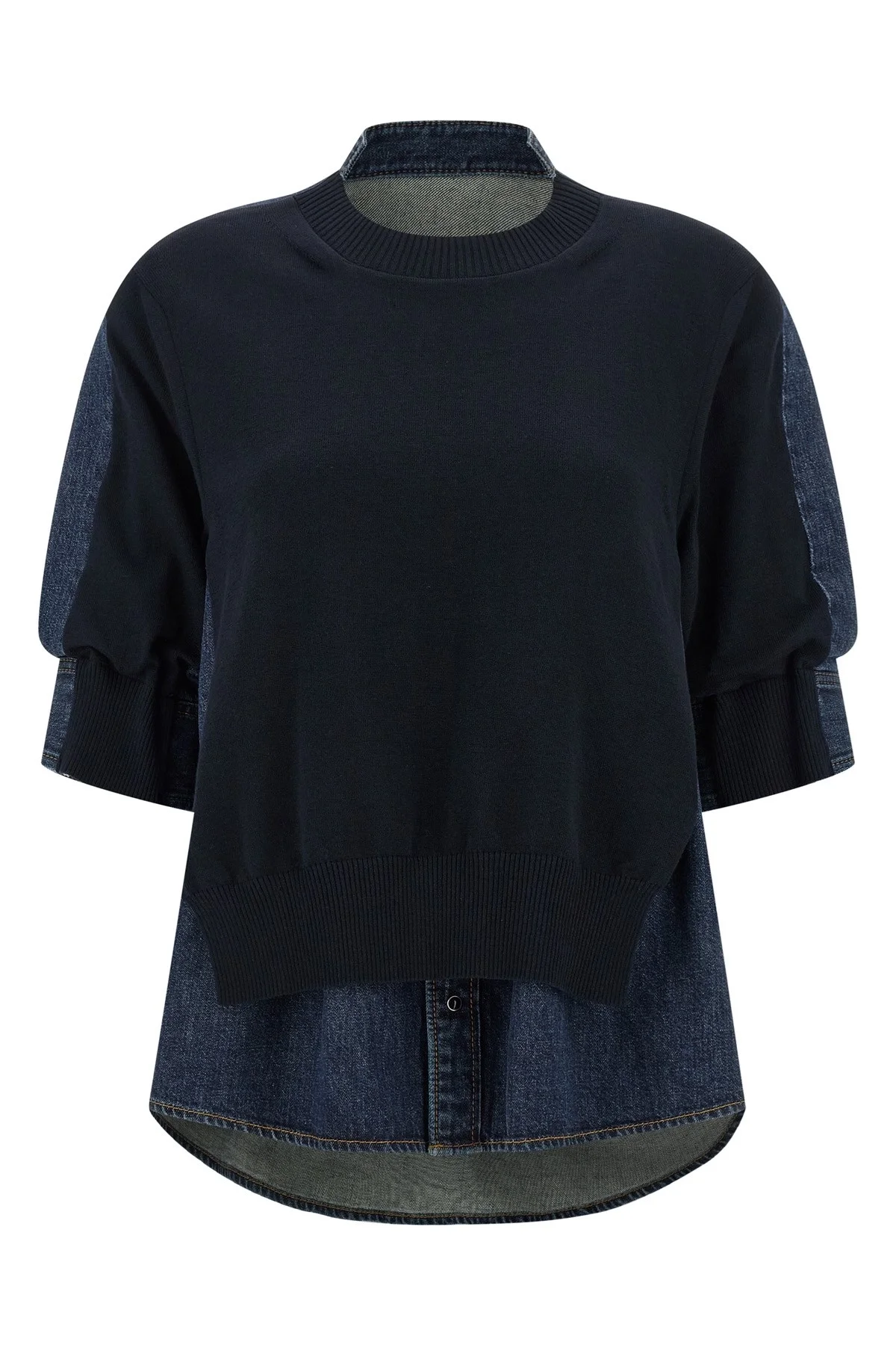 cod. SCW309401 Shirt-style back in cotton denim with contrast stitching and front part in cotton blend, crewneck, short puff sleeves with cuffs and dropped shoulder. Color: Blue Size & Fit: Boxy fit Composition: 57% cotton, 43% polyester Made in: Japan