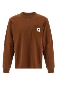 cod. 2500994S642 Sacai x Carhartt Wip cotton capsule T-shirt, cotton canvas pocket with logo patch applique, crew neck, long cuffed sleeves and double layer trompe l'oeil, side slits with snap buttons. Color: Brown Size & Fit: true to size fit Composition: 100% cotton Made in: Japan PROMO CODE NOT APPLICABLE
