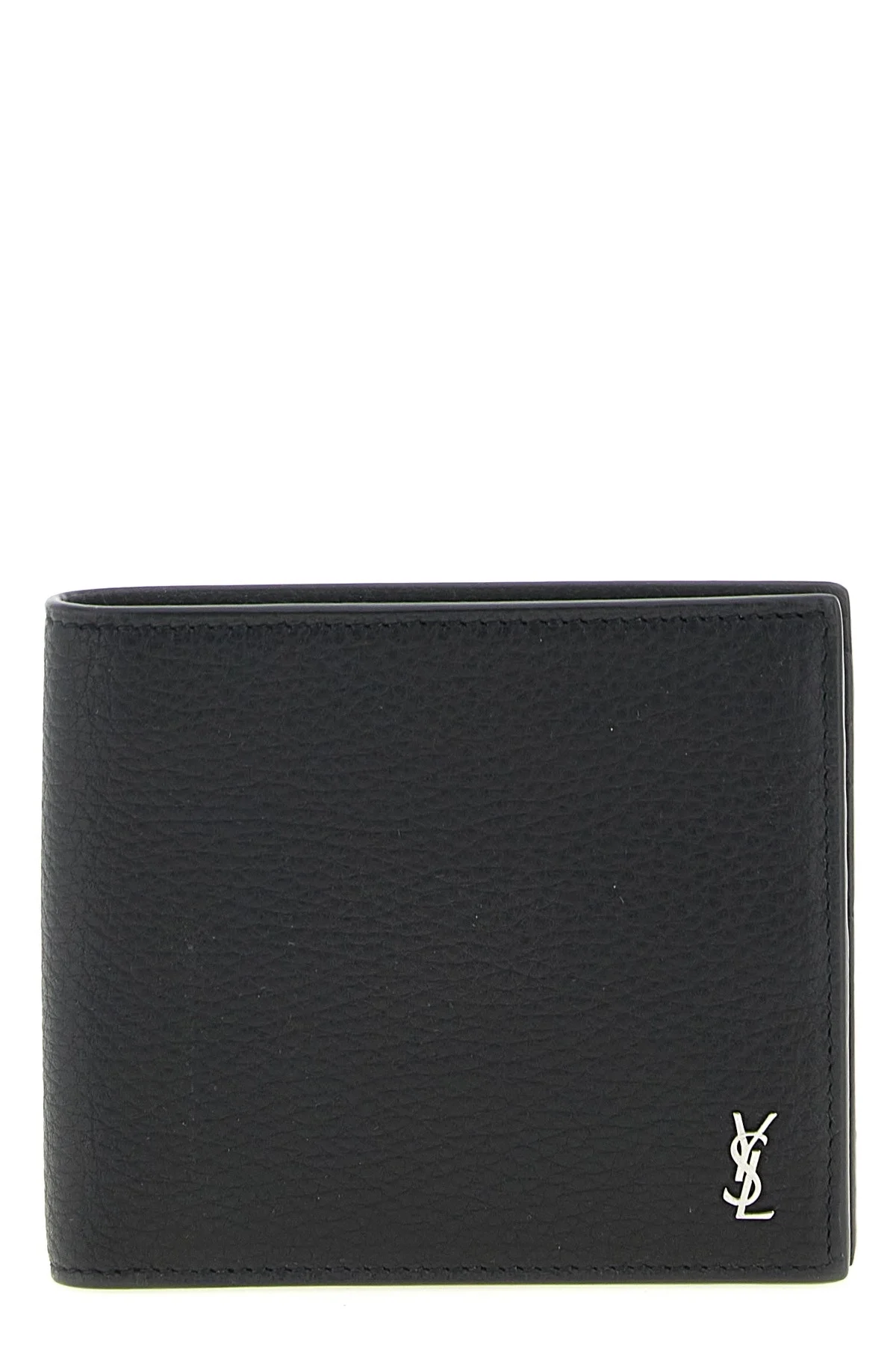 cod. 847954AAELP1000 'East/West' hammered leather wallet, front metal 'Tiny Cassandre' logo, book opening. Color: Black Size & Fit: W 11 x H 9.5 x D 2.5 cm Composition: 100% calfskin leather (Bos Taurus) Made in: Italy
