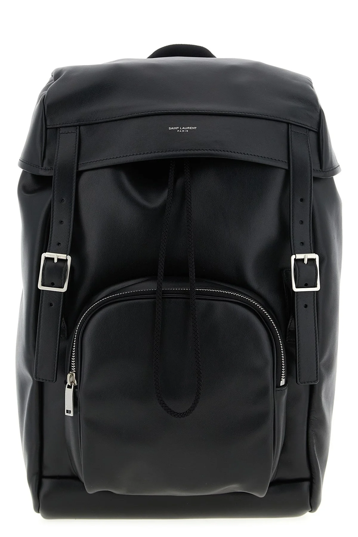 cod. 683857AAFMD1000 Leather backpack, flap closure with snap button and adjustable straps and embossed logo, front zip pocket, inner drawstring, fixed handle and adjustable ribbon shoulder straps, breathable technical fabric backrest. Color: Black Size & Fit: W 25 x H 41 x D 14 cm Composition: 100% calfskin leather (Bos Taurus) Made in: Italy