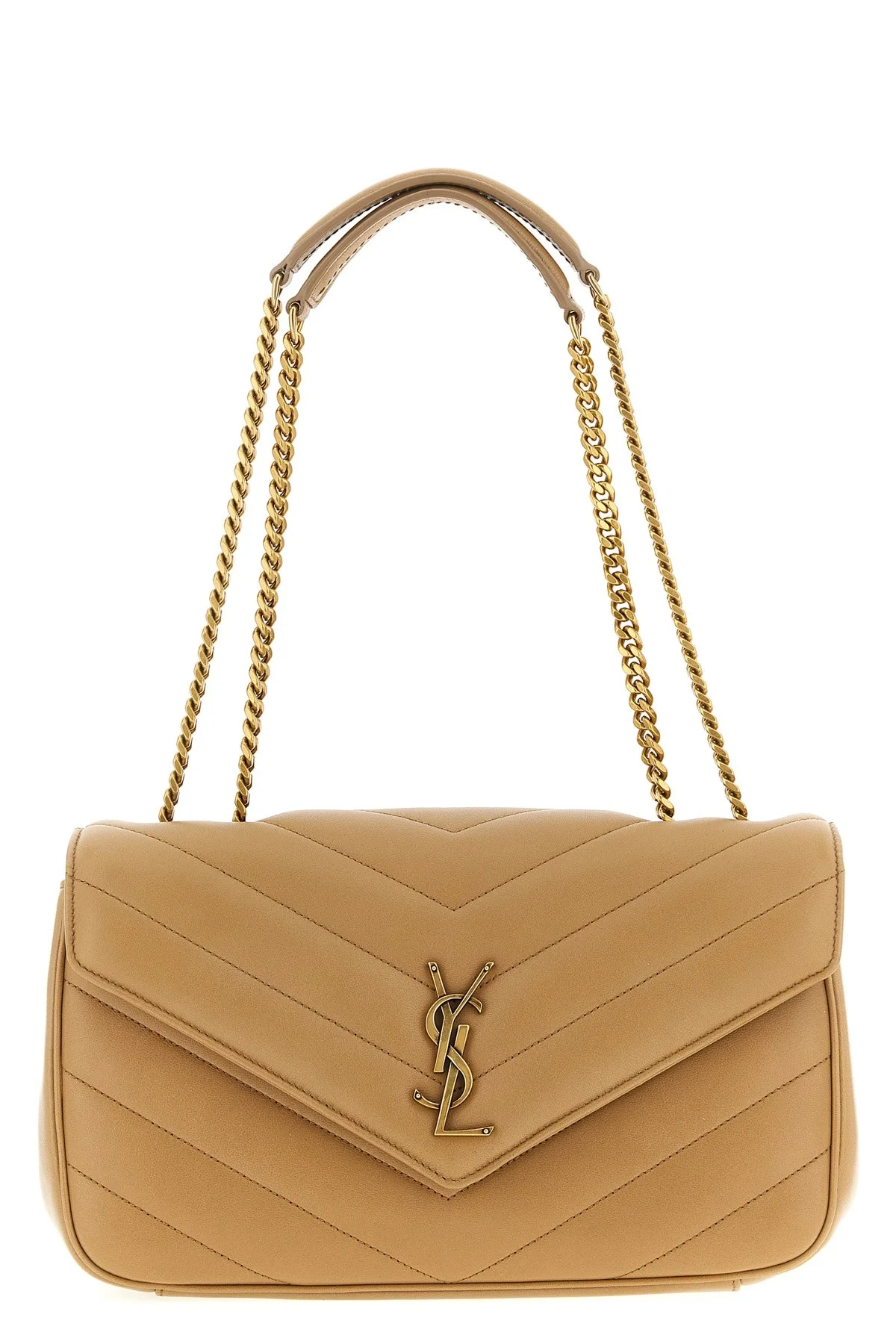 cod. 801439AAEAX2357 'Loulou' medium shoulder bag in lambskin with chevron quilted stitching, magnetic flap closure with antiqued metal Cassandra logo on the front, cotton lining, sliding chain shoulder strap with leather protection, removable clutch bag, mirror. Color: Beige Size & Fit: W 29 x H 17 x D 8 cm Composition: 100% lamb leather (Ovis aries) Made in: Italy PROMO CODE NOT APPLICABLE