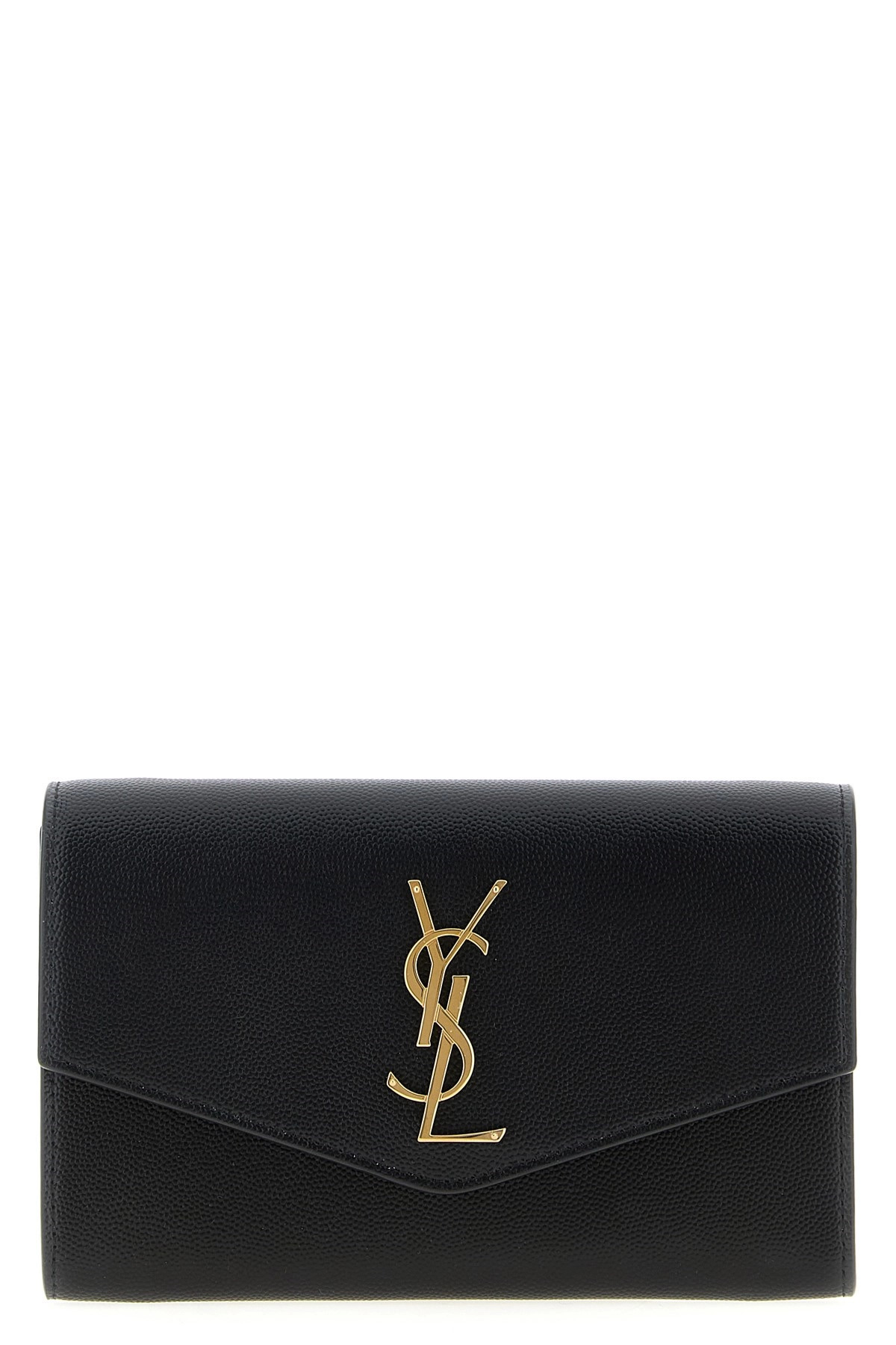 cod. 6077881GF0J1000 Grain de poudre royal leather clutch bag featuring a flap closure with the gold metal logo and gold removable chain. Color: Black Size & Fit: W 19 x H 12 x D 3 cm Composition: 100% calf leather (bos taurus) Made in: Italy PROMO CODE NOT APPLICABLE