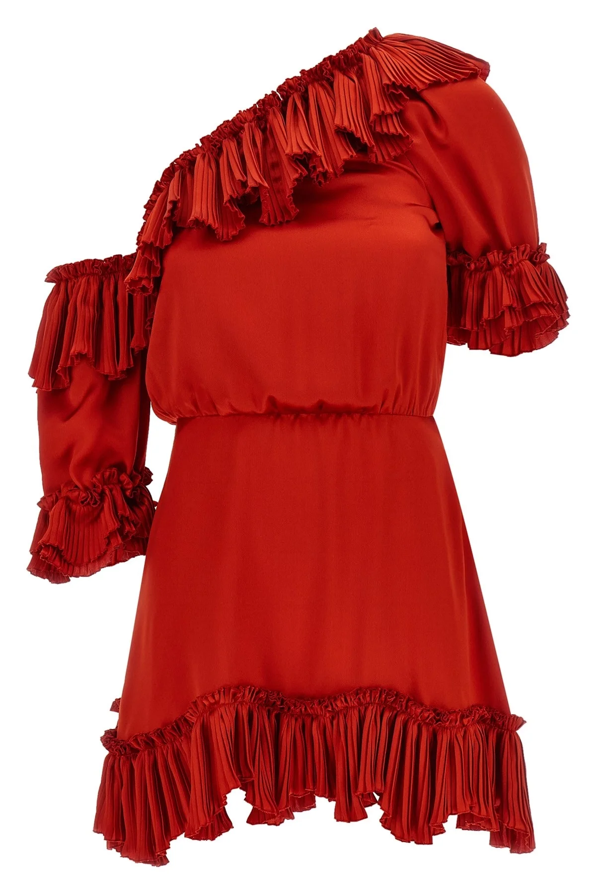 cod. 862002Y7G276850 One-shoulder mini dress in shiny silk satin with short sleeves, pleated ruffles on the sleeves, neckline and hem, slightly curled waist, side closure with hidden zip, and asymmetric length. Color: Red Size & Fit: True to size fit Composition: 100% silk Made in: Italy
