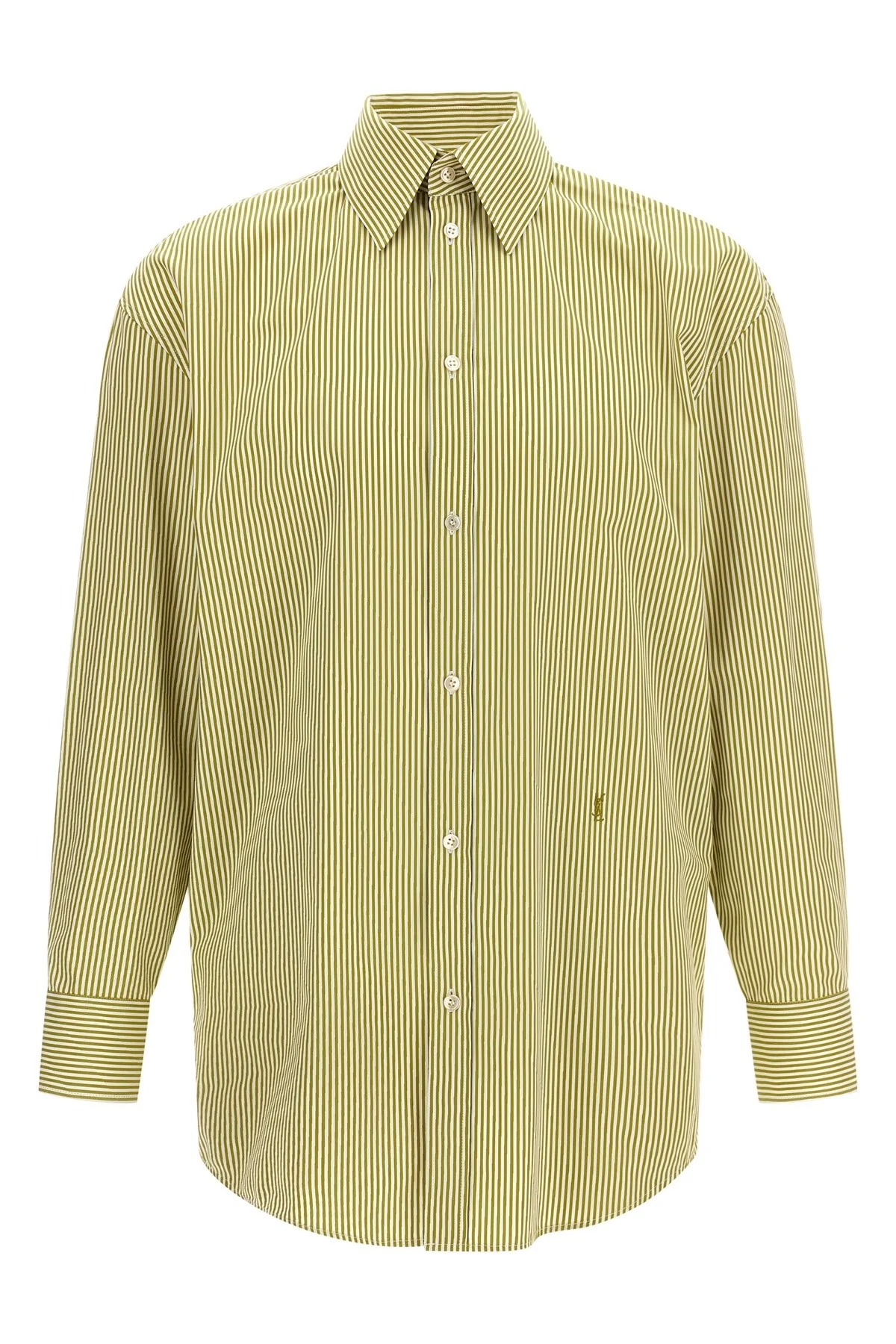 cod. 865483Y260D3302 Striped cotton poplin shirt, 'Cassandre' embroidered logo and mother-of-pearl button closure on the front, pointed collar, long sleeves with two-button beveled cuffs and dropped shoulders, rounded hem. Color: Green Size & Fit: comfort fit - FRENCH size Composition: 100% cotton Made in: Italy