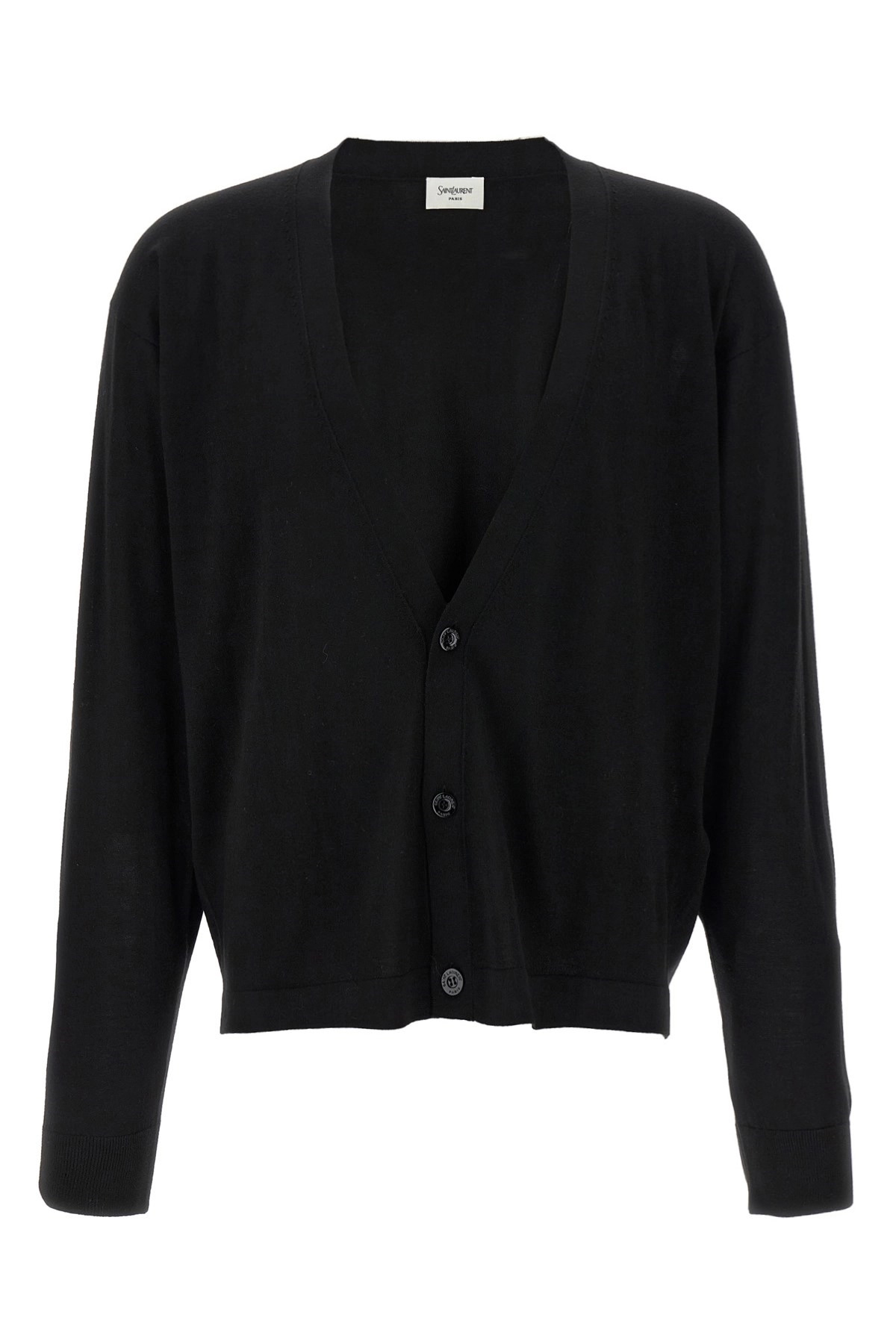cod. 817221Y76TC1000 Fine wool cardigan, V-neck, front button closure, long cuffed sleeves. Color: Black Size & Fit: Comfort fit Composition: 100% wool Made in: Italy