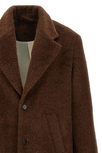 cod. MFW25ALOISBRUSHEDTAUPEALPACA Single-breasted 'Alois' virgin wool, mohair and alpaca blend long coat with front horn button closure, lapel collar, welt pockets, slightly padded shoulder strap, long sleeves, back split, viscose lining. Color: Brown Size & Fit: true to size fit Composition: 45% wo, 20% wm, 20% wp, 15% ny Made in: North Macedonia