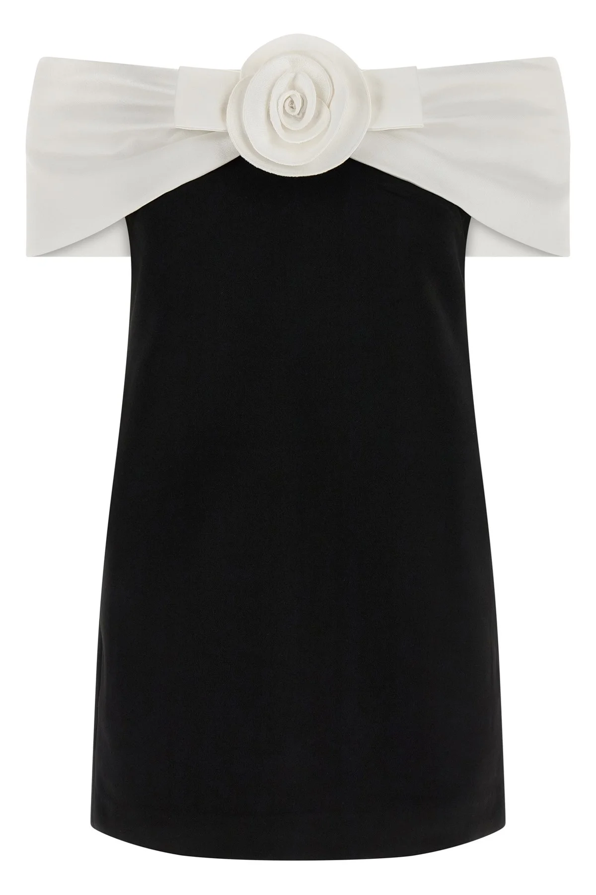 cod. RS26180SBBLACK Black Crepe Flower Mini' off-the-shoulder crepe dress with sculptural bodice with contrasting wraparound detail on the shoulders with central flower, wide neckline and back zip closure, pockets, short sleeves, lining. Color: White/Black Size & Fit: slim fit - UK size Composition: 100% polyester Made in: China