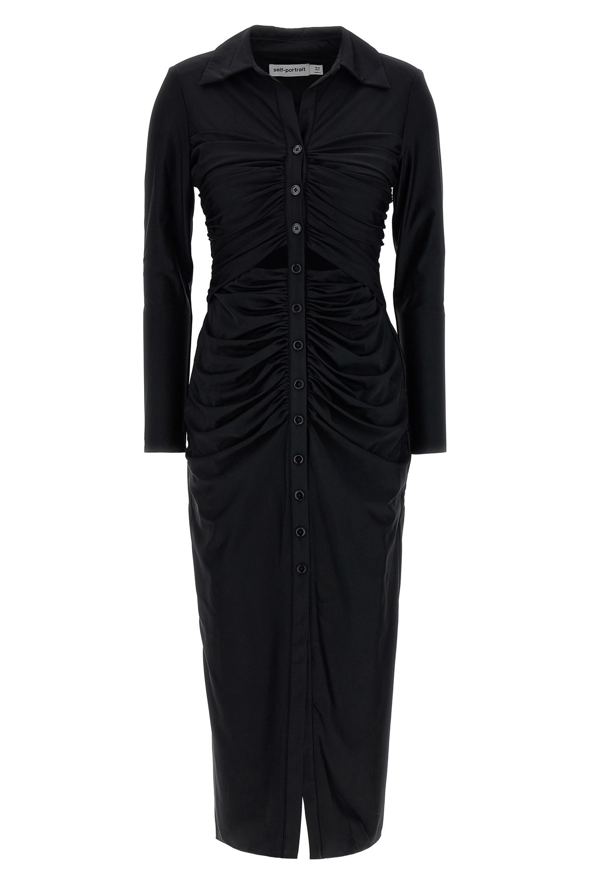cod. RS24021MBBLACK 'Black Jersey Cut Out Midi' dress in stretch jersey with curls and front cut-out detail, collar, button closure, long sleeves. Color: Black Size & Fit: true to size fit UK size Composition: 80% polyamide, 20% elastane Made in: China