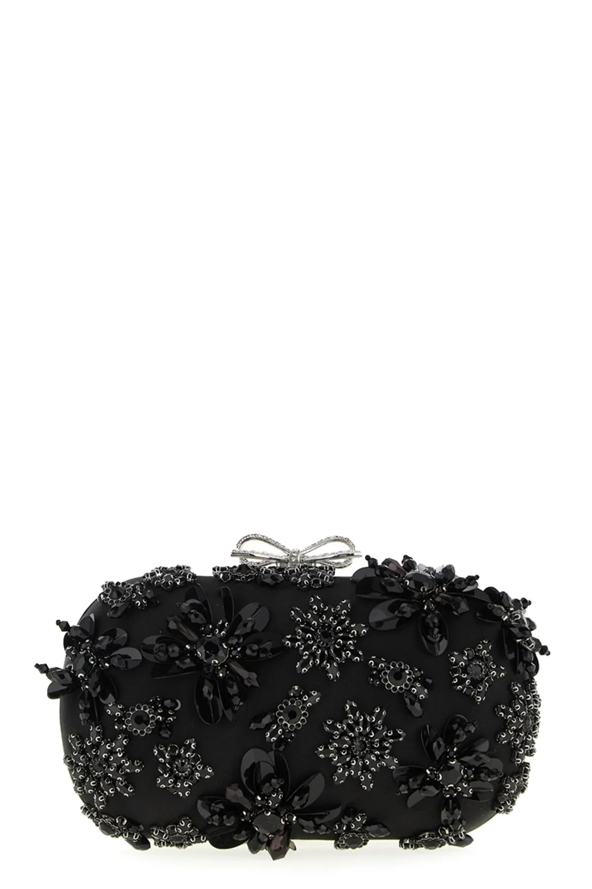 cod. RS26304BBLACK Black Satin Floral Crystal' satin clutch with front floral embroidery in beads and crystals, interlocking closure with top jewel bow application, removable chain shoulder strap. Color: Black Size & Fit: W 17.5 x H 10 x D 7 cm Composition: 93% polyester 7% elastane Made in: China