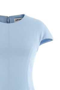 cod. SS26095SBLBLUE 'Blue Crepe Lace' crepe de chine mini dress with perforated lace skirt insert with underskirt, crew neck model, back zip and hook closure, short sleeves. Color: Light Blue Size & Fit: True to size fit UK size Composition: 100% polyester Made in: China