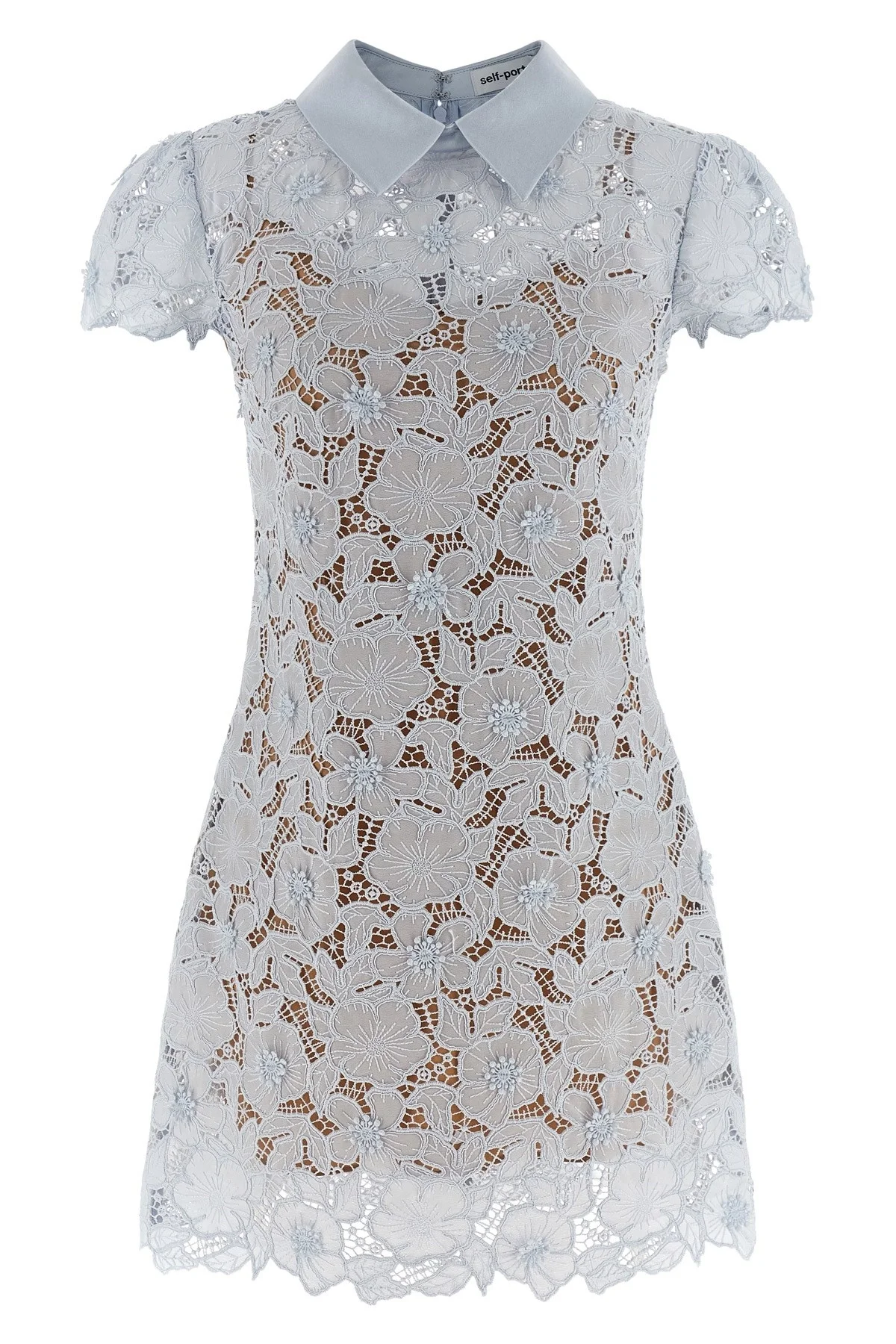 cod. RS26171SBLBLUE Guipure semi-transparent lace Blue Guipure Lace Mini dress with 3D floral applique, tone-on-tone satin shirt collar, back zip closure, short sleeves, asymmetric hem, and removable petticoat. Color: Light Blue Size & Fit: true to size fit - UK sizing Composition: 100% polyester Made in: China