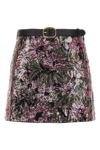 cod. RS26075SKMUMULTI Floral Sequin Mini fabric skirt with multicolored floral sequin embroidery, pockets, back zip closure, lining, removable leather belt. Color: Pink Size & Fit: slim fit - UK size Composition: 100% polyamide Made in: China
