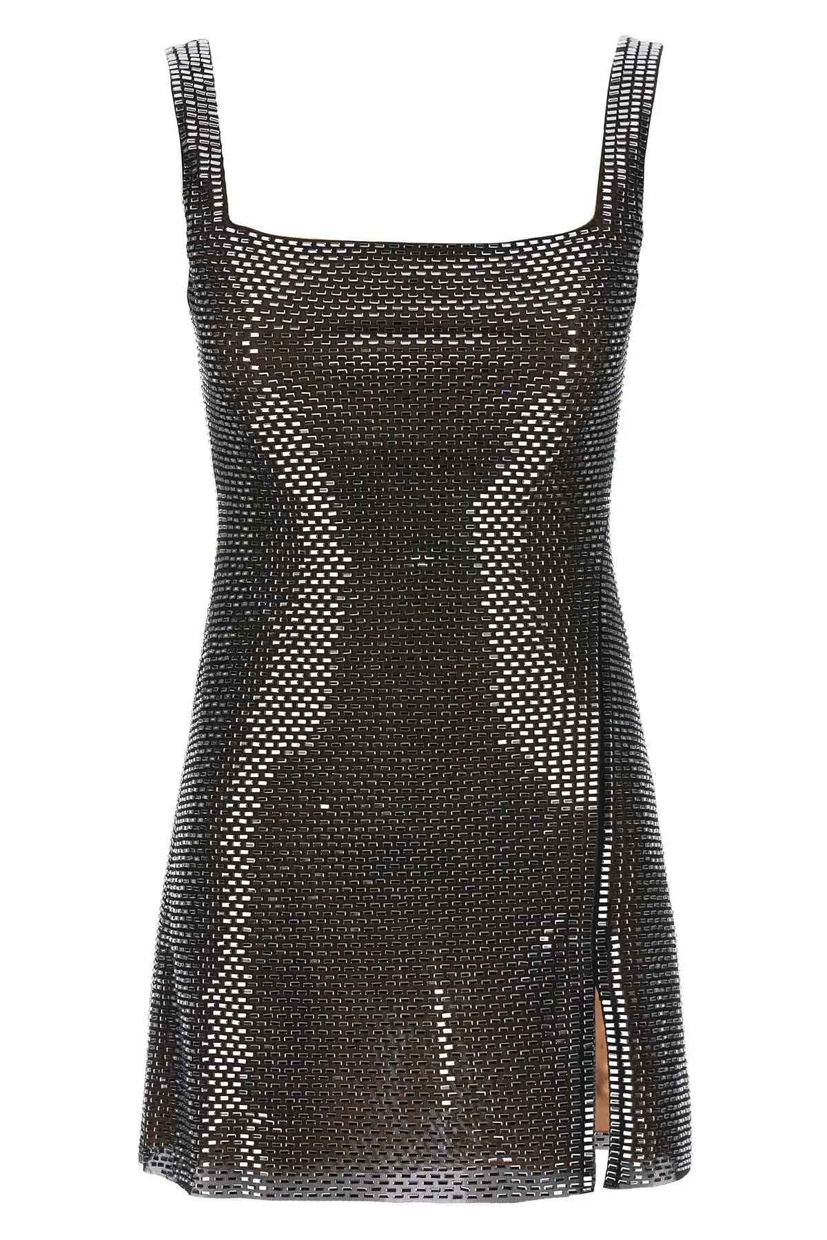 cod. RS26051SBGRGREY Gunmetal Rhinestone Mesh Mini' mesh knit dress with all-over baguette crystal applique, sleeveless square neckline at the front and back, hourglass silhouette with flared skirt, front split, back zip closure, lining. Color: Gray Size & Fit: true to size fit - UK sizing Composition: 95% polyester 5% elastane Made in: China
