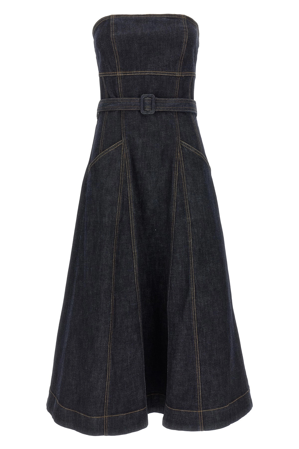 cod. PF25801MABLBLUE Off-the-shoulder 'Indigo Denim Bandeau Midi Dress' cotton denim dress with contrast stitching, inner corset with back hook closure, flared skirt, pockets, back zip closure, removable matching belt. Color: Blue Size & Fit: slim fit - UK SIZE Take one size up if between sizes Composition: 94% cotton 5% polyamide 1% elastane Made in: China