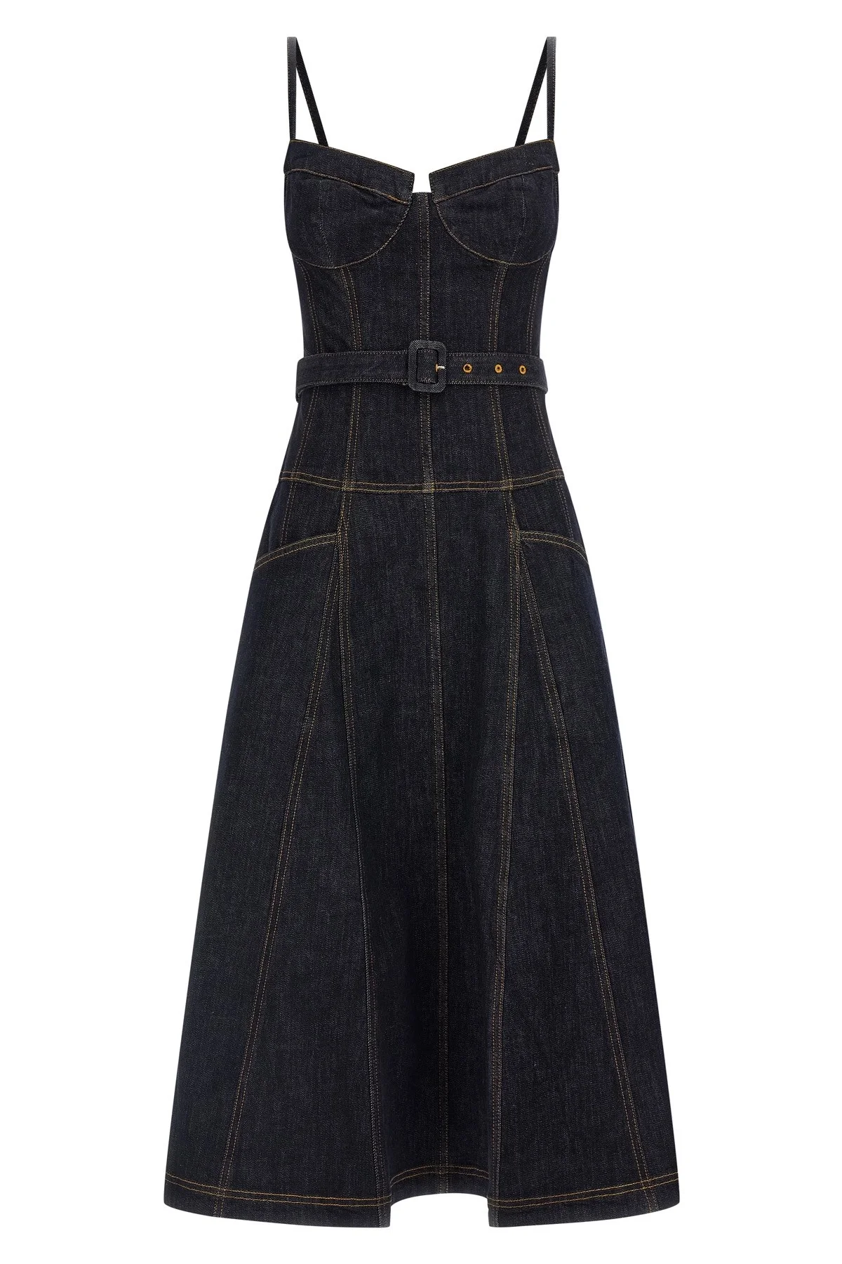 cod. RS26815MABLBLUE 'Indigo Denim Flared Midi' cotton denim dress with contrast stitching, sweetheart neckline, thin straps, back zip closure, flared full skirt, pockets, removable matching belt. Color: Blue Size & Fit: true to size fit - UK sizing Composition: 94% cotton 5% polyester 1% elastane Made in: Hong Kong