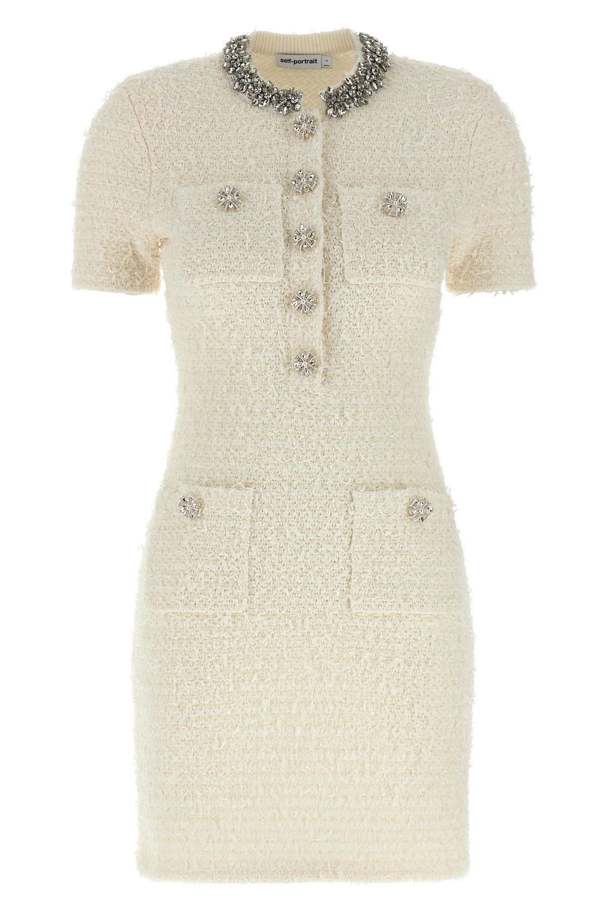 cod. AW25028SCCREAM Mini dress in slightly stretch knit tweed effect, texture with fringes, crew neck with crystal application and jewel buttons, pockets, short sleeves Color: White Size & Fit: True to size fit Composition: 41% co, 30% pes, 15% pa, 13% wo, 1% ea Made in: China