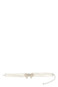 cod. RS26628NCCREAM 'Pearl Satin Bow' necklace with crystals and pearls, three-thread crew neck, front bow detail, carabiner closure. Color: White Composition: 55% brass 43% glass 2% st Made in: China