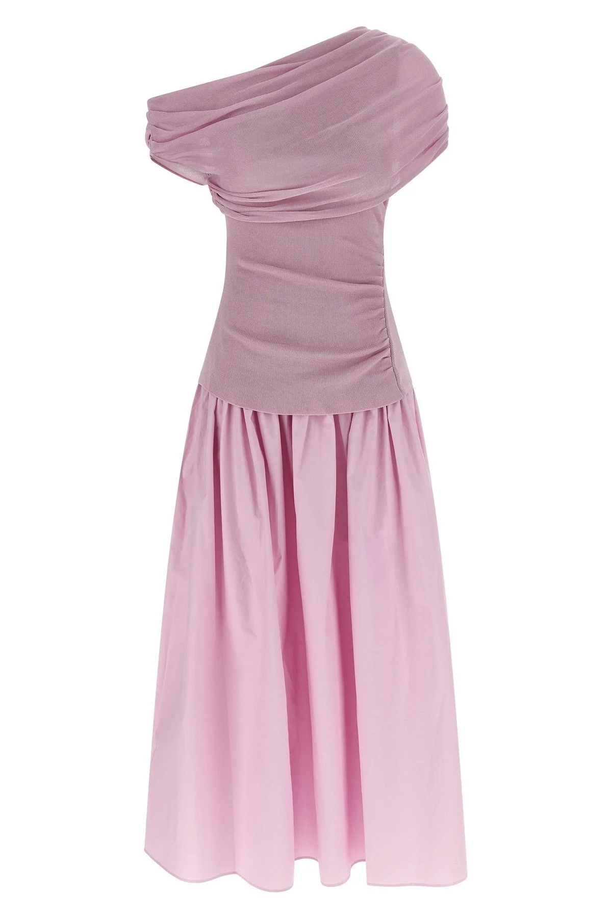 cod. RS26108MPPINK 'Pink Cotton Draped Knit Midi' off-the-shoulder dress with draped knit top with asymmetric neckline, front curled bust, short sleeves and removable cotton poplin bottom, flared silhouette curled on wheels, high waistband, side zip closure. Color: Pink Size & Fit: true to size fit - UK sizing Composition: 79% viscose 17% cotton 4% polyamide Made in: China