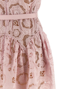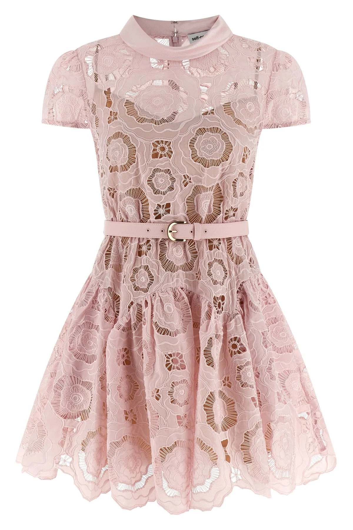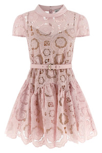cod. RS26167SPPINK Pink Floral Lace Mini floral lace dress with high neck, balloon skirt, back zipper closure, short sleeves, removable petticoat, and removable matching belt. Color: Pink Size & Fit: true to size fit - UK sizing Composition: 100% polyester Made in: China