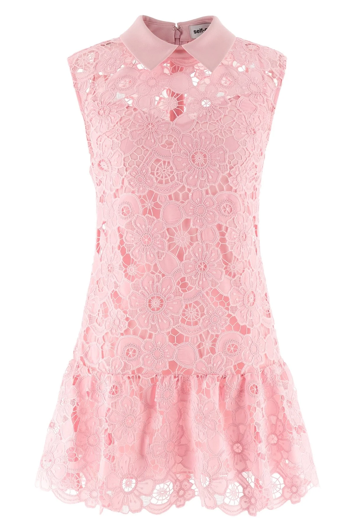 cod. SS26164SAPPINK Mini 'Pink Lace collared' openwork lace dress with tone-on-tone detachable petticoat, shirt collar, sheath dress with ruffle curled on the hem, back closure with hidden zip, sleeveless. Color: Pink Size & Fit: True to size fit UK sizing Composition: 100% polyester Made in: China