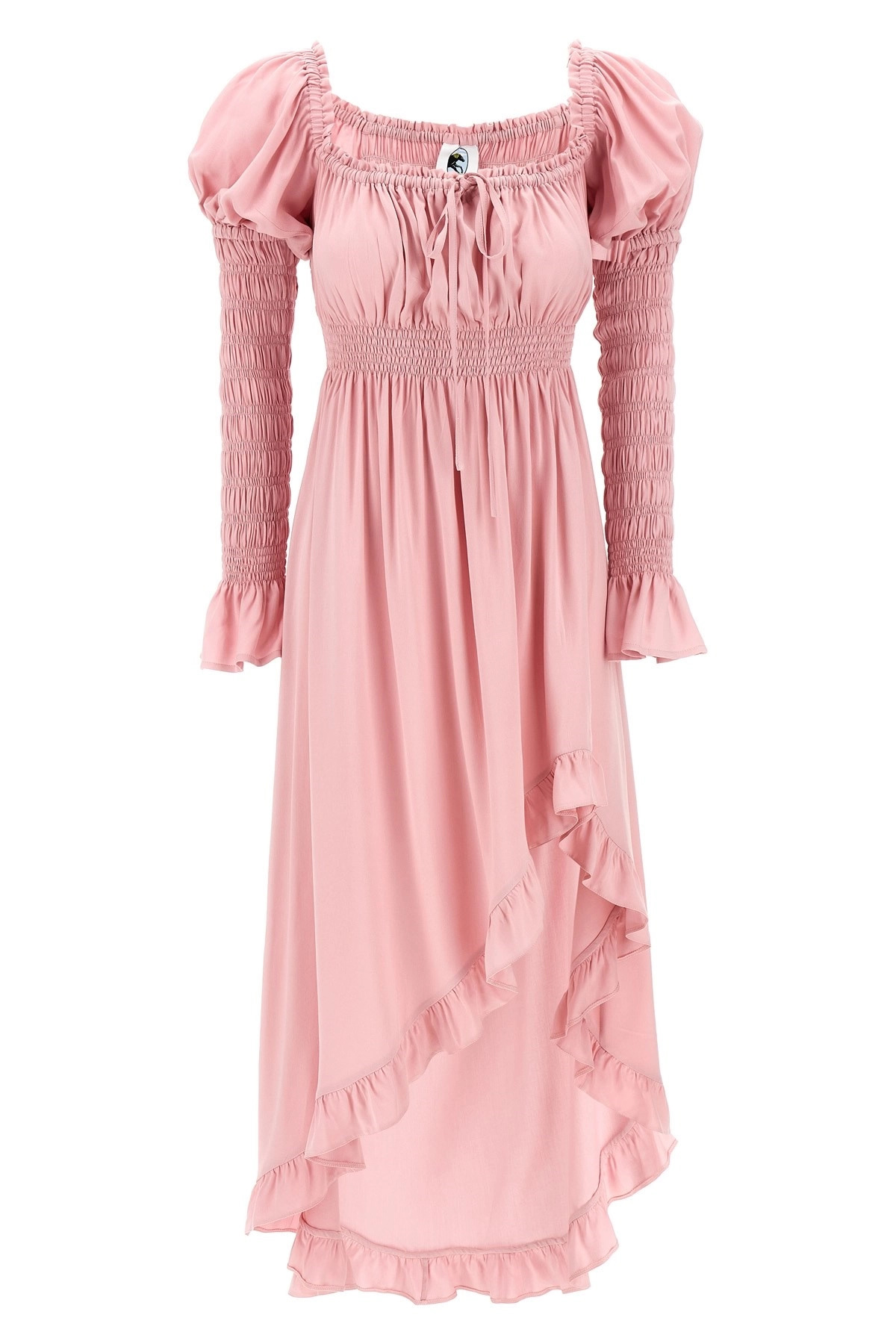 cod. WADR02P006NPINK 'Juliette' dress in crinkled viscose, square neckline with drawstring, long puff sleeves with ruffled cuffs, asymmetrical pleated skirt with ruffles on the hem and front split. Color: Pink Size & Fit: Comfort fit Composition: 100% viscose Made in: Ukraine