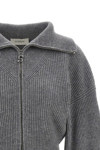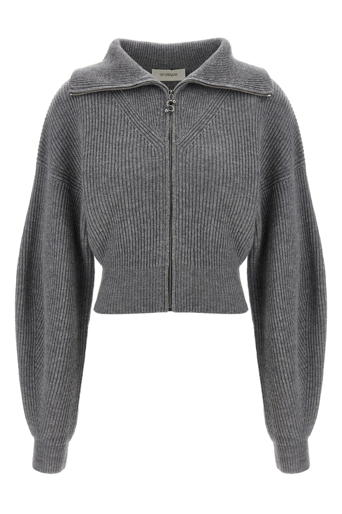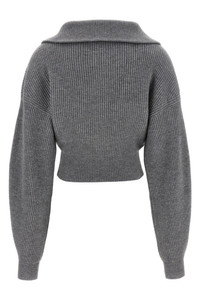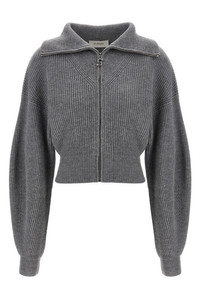 cod. 2522346012600004 'Calypso' ribbed wool and cashmere cardigan, turned-up collar, front zip closure with metal logo zipper puller, long wide sleeves with cuffs and dropped shoulders. Color: Gray Size & Fit: true to size fit Composition: 80% wool 20% cashmere Made in: China