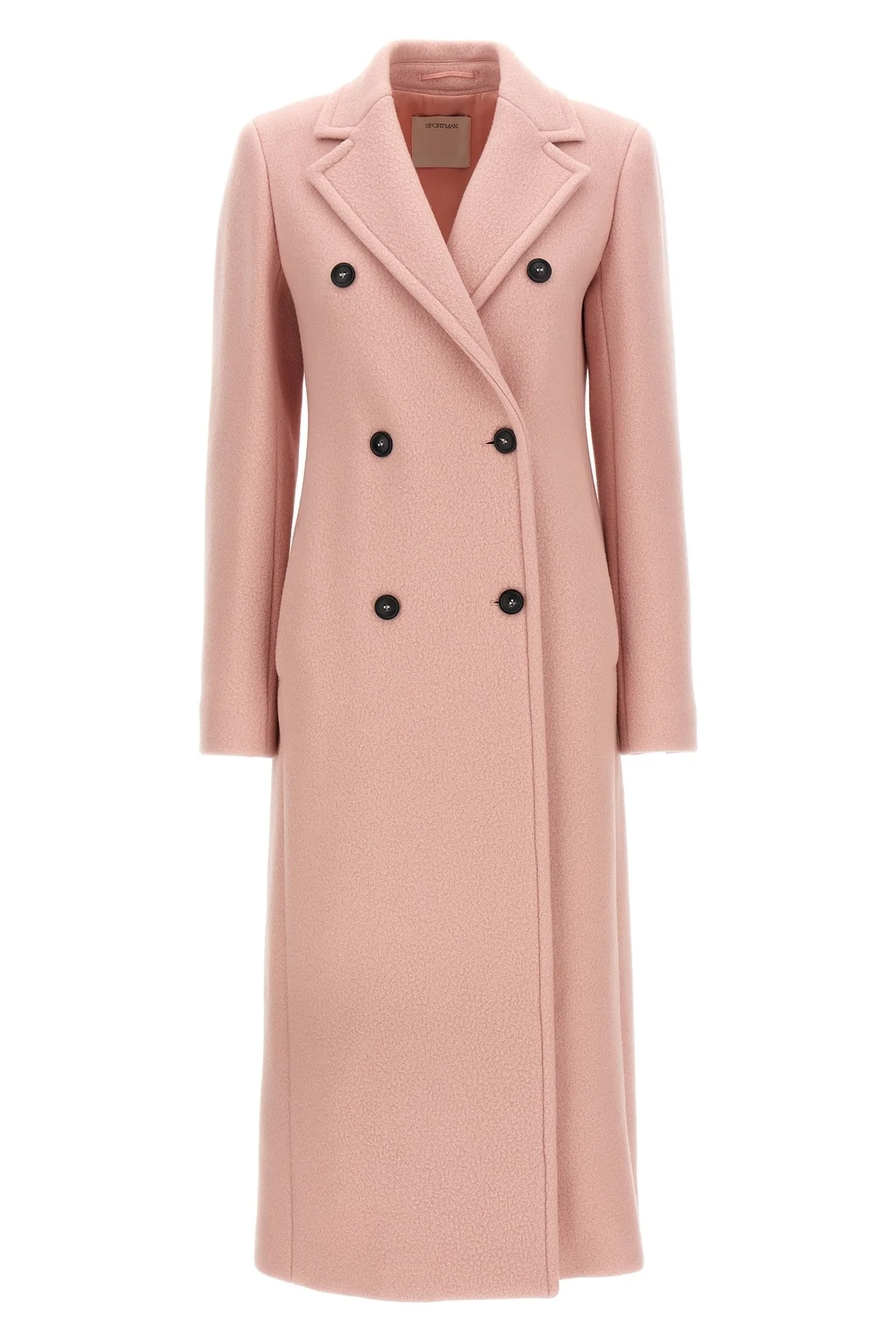 cod. 2522016032600003 'Comune' double breast coat in pure virgin wool with front button closure, lapel collar, pockets, structured shoulder strap, long sleeves, martingale and rear overlapping split, viscose blend lining. Color: Pink Size & Fit: true to size fit Composition: 100% virgin wool Made in: Poland