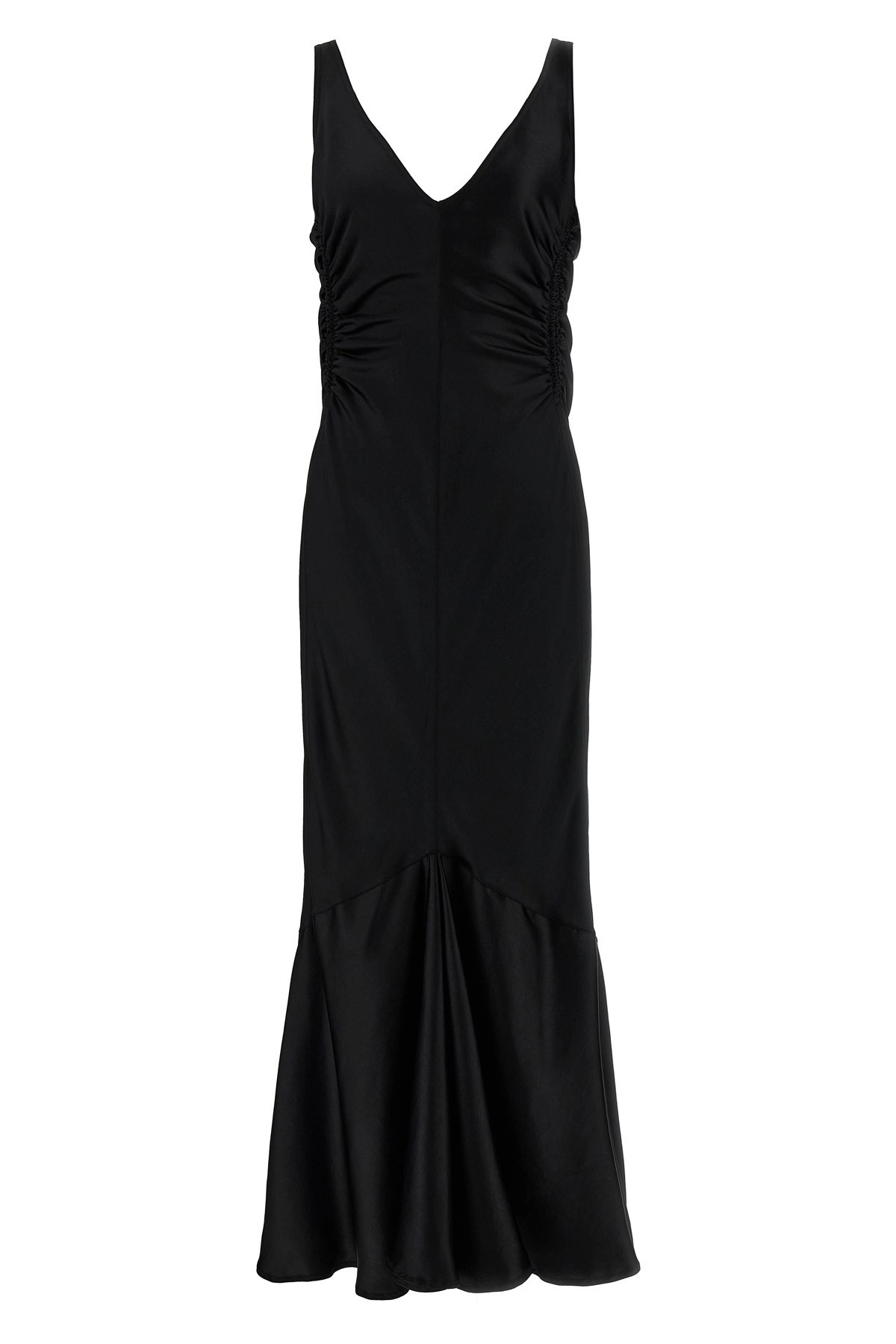 cod. 2512221042600003 Long satin Katia dress, deep V-neck front and back, crinkled hips with elastic, sleeveless mermaid skirt with oblique cut. Color: Black Size & Fit: true to size fit Composition: 100% polyester Made in: Poland