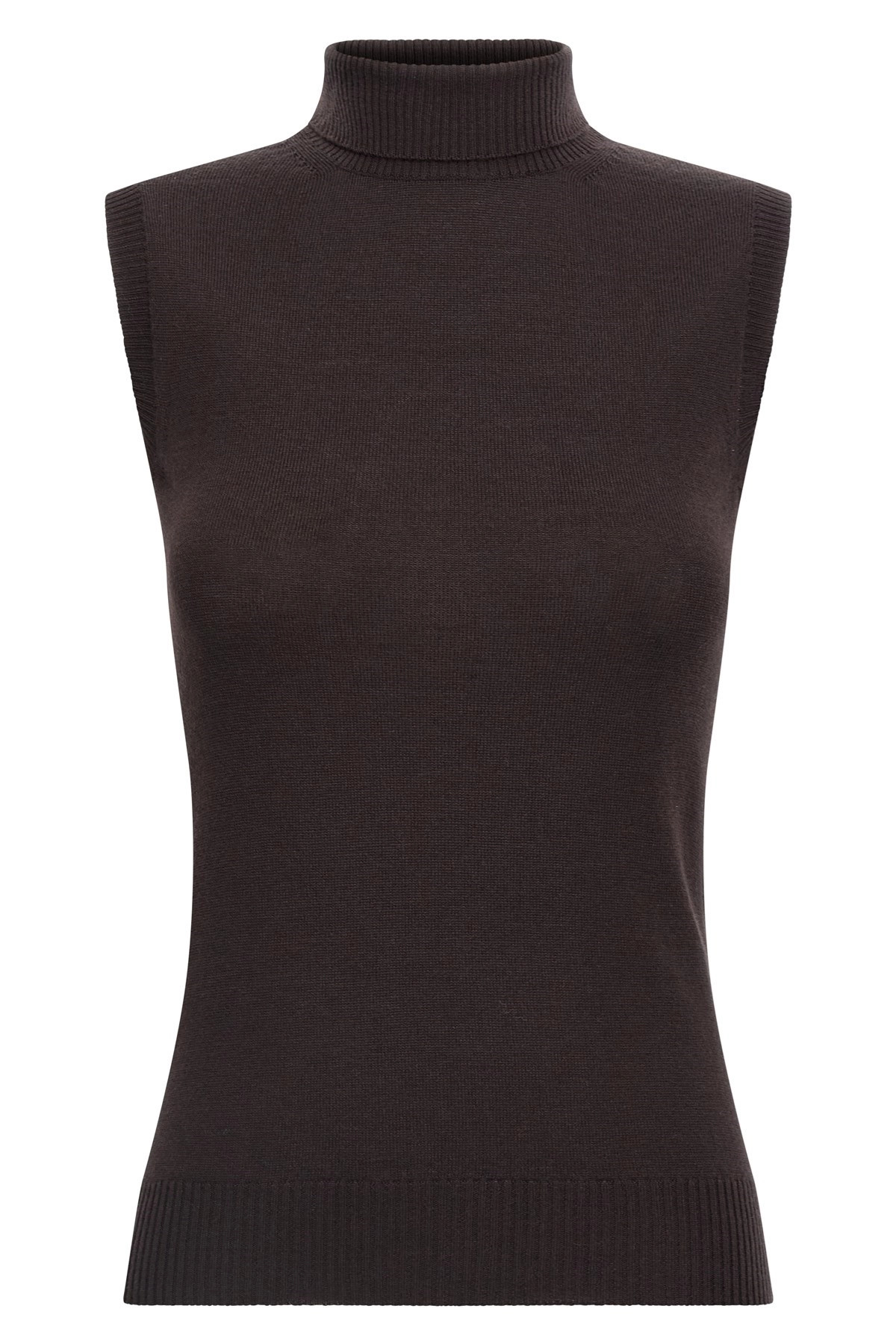 cod. 2522366011600006 'Vertigo' breast in pure wool yarn thin, high neck, sleeveless. Color: Brown Size & Fit: true to size fit Composition: 100% virgin wool Made in: Romania