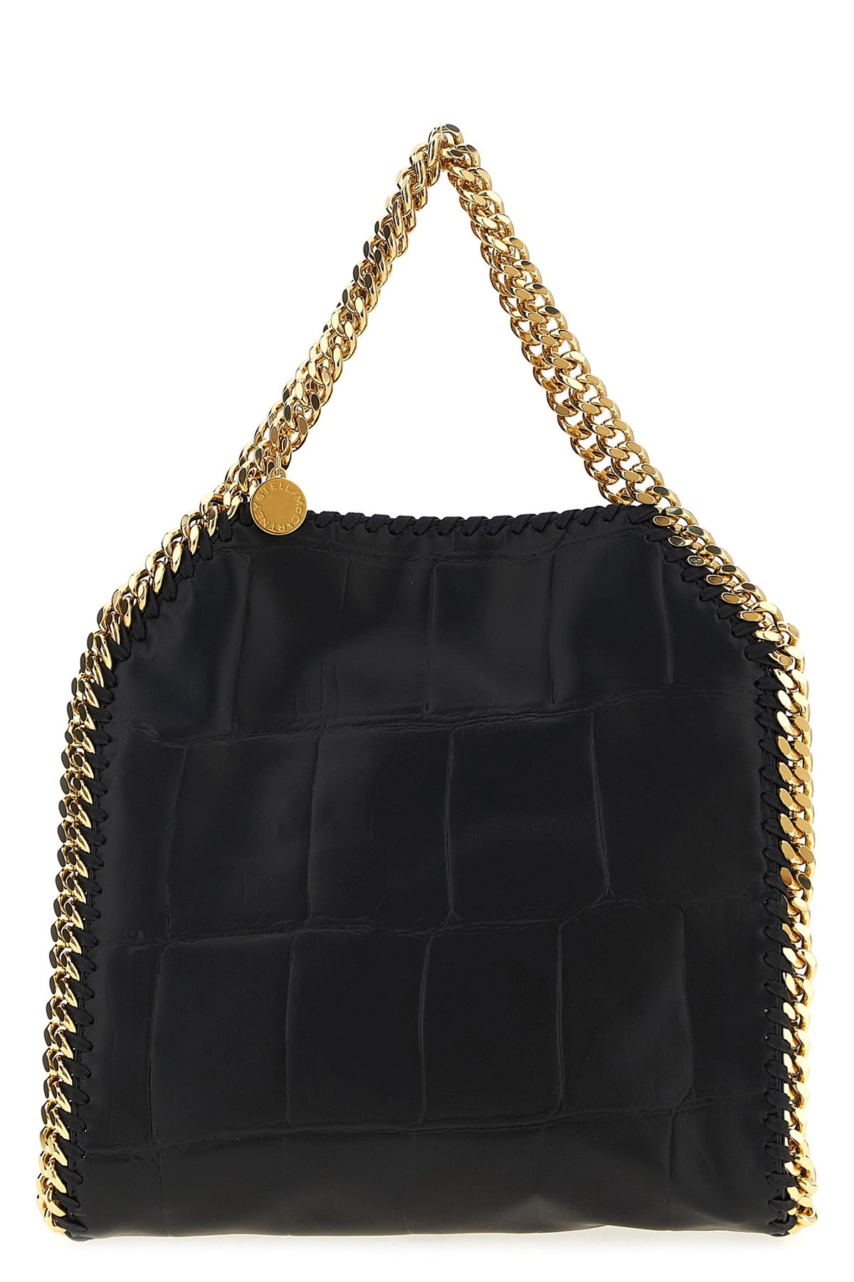 cod. 371223WP05791000 'Falabella' mini shopping bag in YATAY M crocodile pattern, double fixed handle and diamond-effect chain shoulder strap in brass and aluminium, medallion charm with engraved logo, magnetic closure, monogram fabric lining. SUSTAINABLE: This product is made of YATAY M. A vegan alternative to animal skin formulated with mushroom mycelium and recycled materials. Color: Black Size & Fit: W 26.5 x H 23.5 x D 10 cm Composition: 100% polyester Made in: Italy