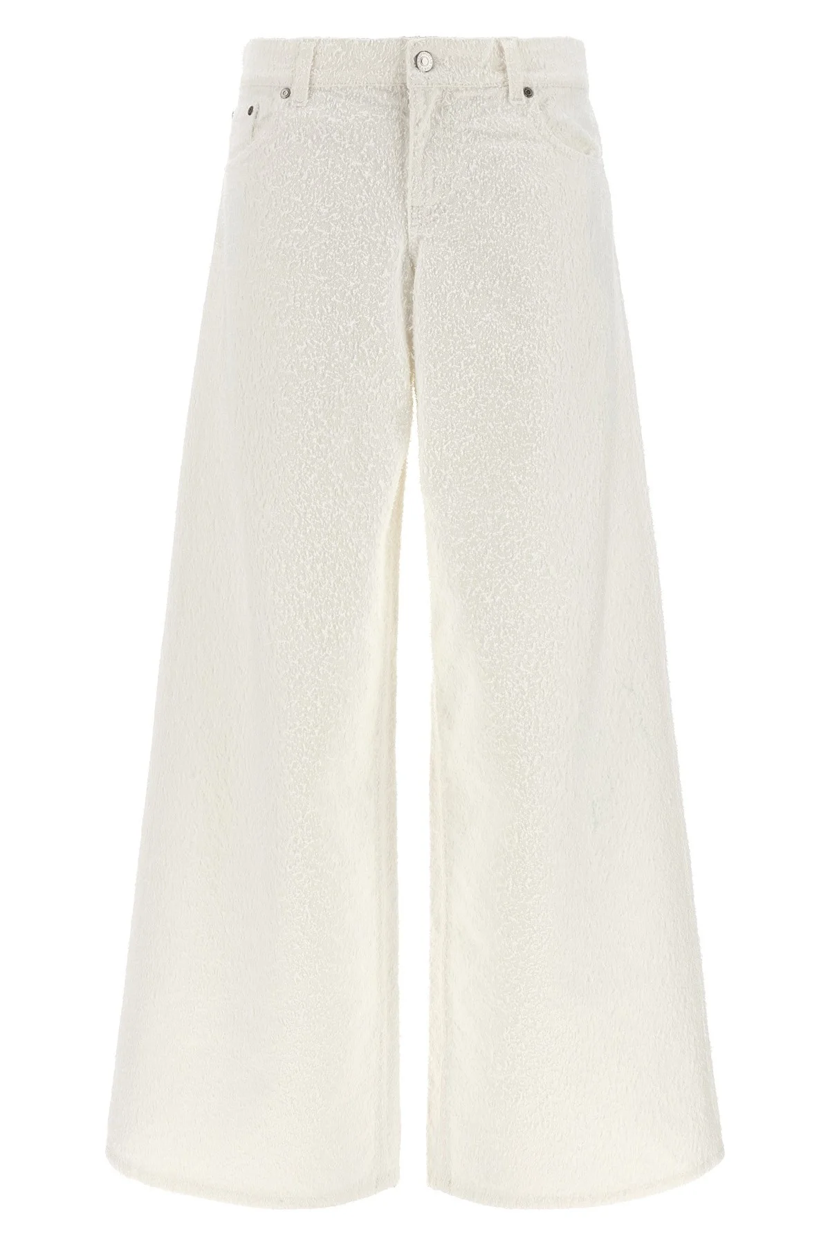 cod. 6D04603SQH469001 Cotton denim jeans with boucle pattern, 5-pocket model, medium waist, wide leg, front zip and button closure. Color: White Size & Fit: True to size fit Composition: 100% cotton Made in: Italy