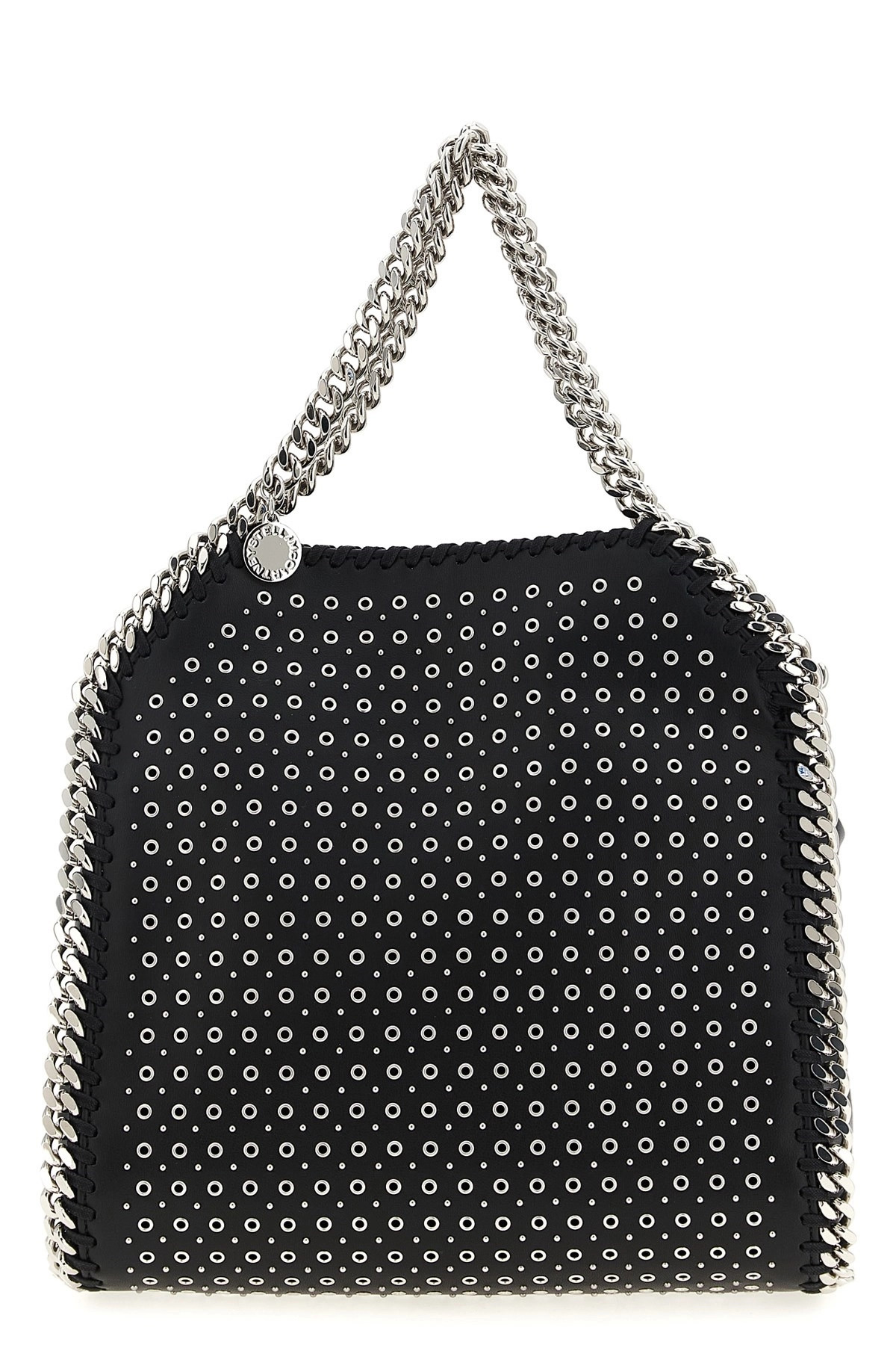 cod. 371223WP05821000 'Mini Falabella' handbag in leather-effect fabric with all-over stud applique, diamond-effect chain, double fixed handle, magnetic closure, chain shoulder strap, medallion charm with engraved logo. SUSTAINABLE: Products that do not use leather respecting cruelty free ethics. Color: Black Size & Fit: W 26, 5 x H 23, 5 x D 10 cm Composition: 100% polyester Made in: Italy