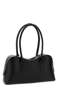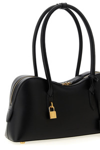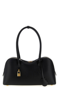 cod. 7B0138WP05331000 'Ryder' shoulder bag in hammered leather-effect fabric, metal padlock detail and front embossed logo, double fixed handle, top zip closure, canopy hemp lining. SUSTAINABLE: Products that do not use leather respecting cruelty-free ethics. Color: Black Size & Fit: W 36 x H 17.5 x D 10 cm Composition: 100% polyamide Made in: Italy