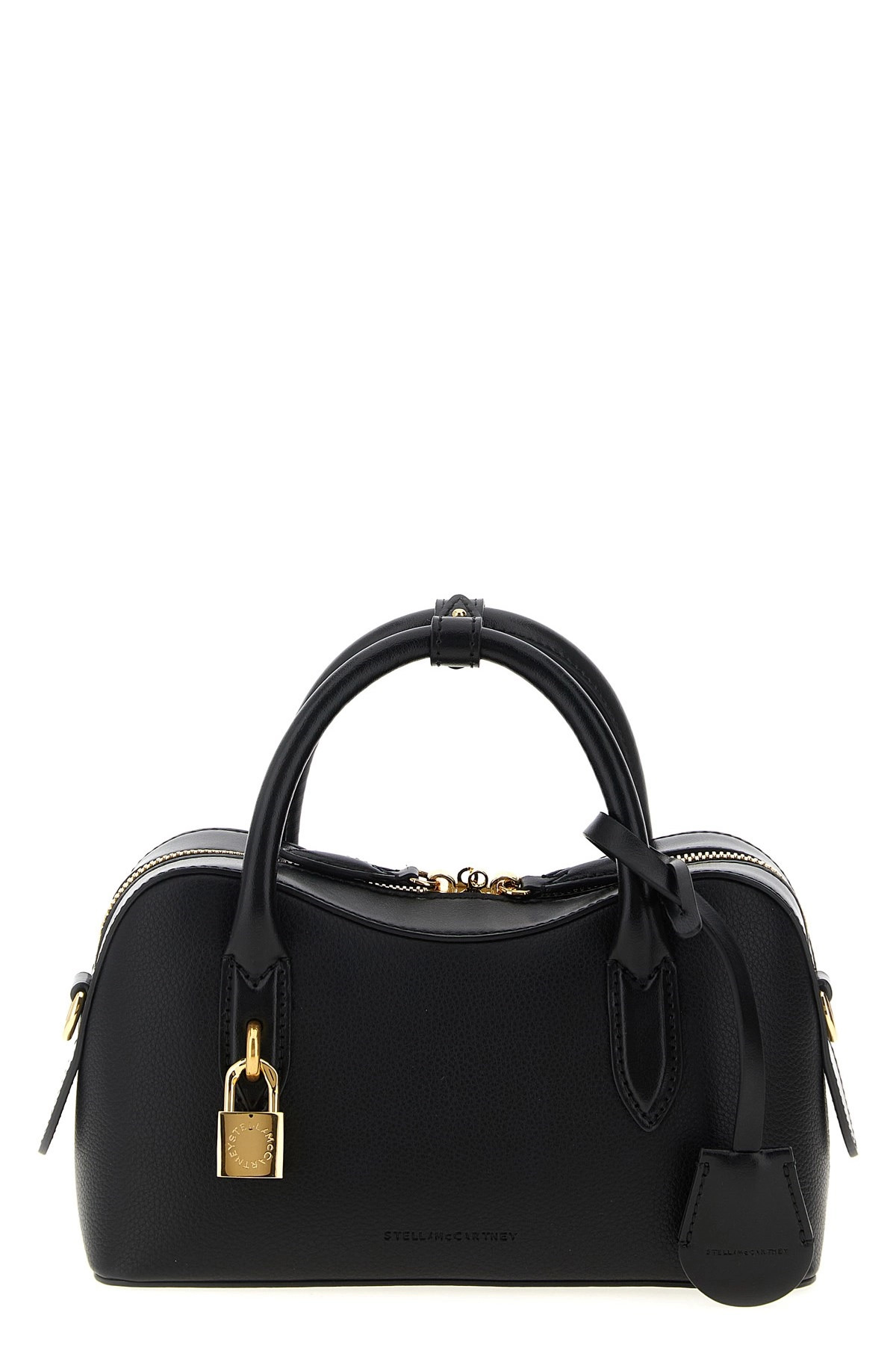 cod. 7B0139WP05331000 Small 'Stella Ryder' crossbody bag in hammered leather-effect fabric, metal padlock detail and front embossed logo, double fixed handle, zip closure, adjustable and removable shoulder strap. SUSTAINABLE: Products that do not use leather respecting cruelty-free ethics. Color: Black Size & Fit: W 22 x H 13 x D 9 cm Composition: 100% polyamide Made in: Italy