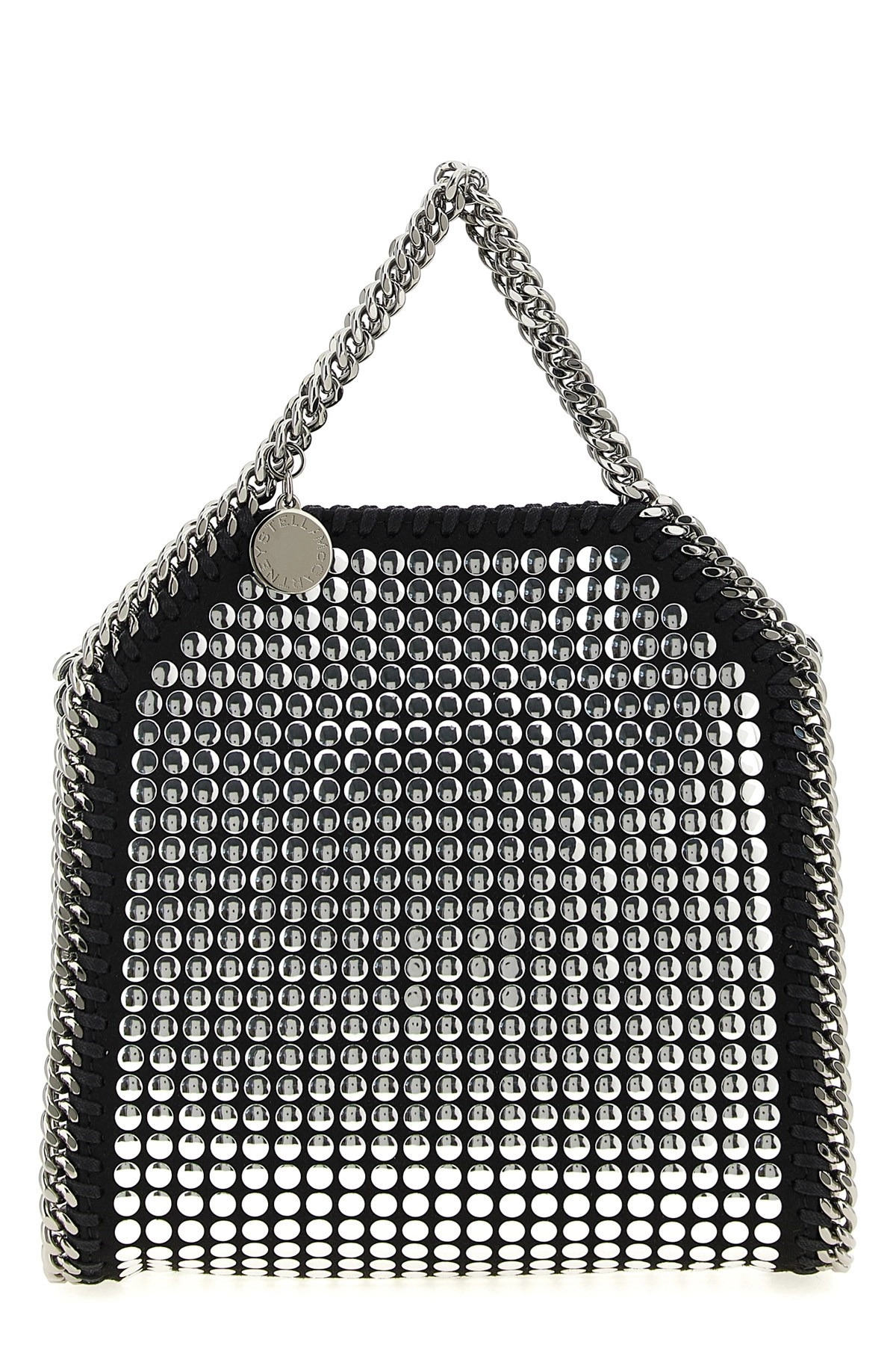 cod. 391698WP05831000 'Tiny Falabella' handbag in leather-effect fabric with all-over stud applique, silver chain, double fixed handle, magnetic closure, chain shoulder strap, medallion charm with engraved logo. SUSTAINABLE: Products that do not use leather respecting cruelty free ethics. Color: Black Size & Fit: W 18 x H 17.5 x D 6 cm Composition: 100% polyamide Made in: Italy